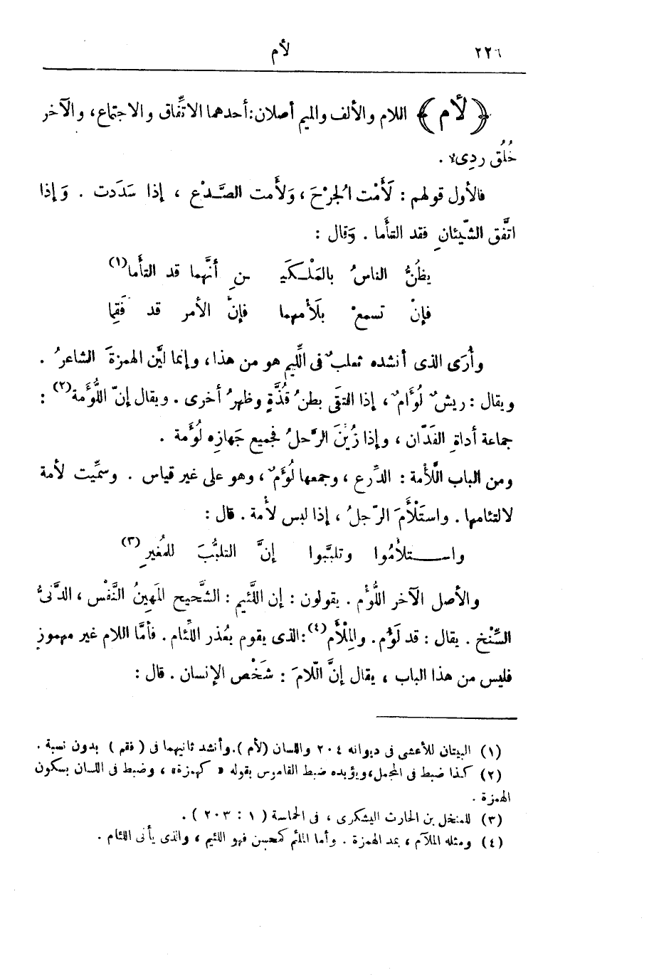 وَالْأَصْلُ الْآخَرُ اللُّؤْمِ. يَقُولُونَ: إِنَّ اللَّئِيمَ: الشَّحِيحُ الْمَهِينُ النَّفْسِ، الدَّنِيُّ السِّنْخِ. يُقَالُ: قَدْ لَؤُمَ. وَالْمِلْأَمُ: الَّذِي يَقُومُ بِعُذْرِ اللِّئَامِ. فَأَمَّا اللَّامُ غَيْرُ مَهْمُوزٍ فَلَيْسَ مِنْ هَذَا الْبَابِ، يُقَالُ إِنَّ اللَّامَ: شَخْصُ الْإِنْسَانِ. قَالَ: