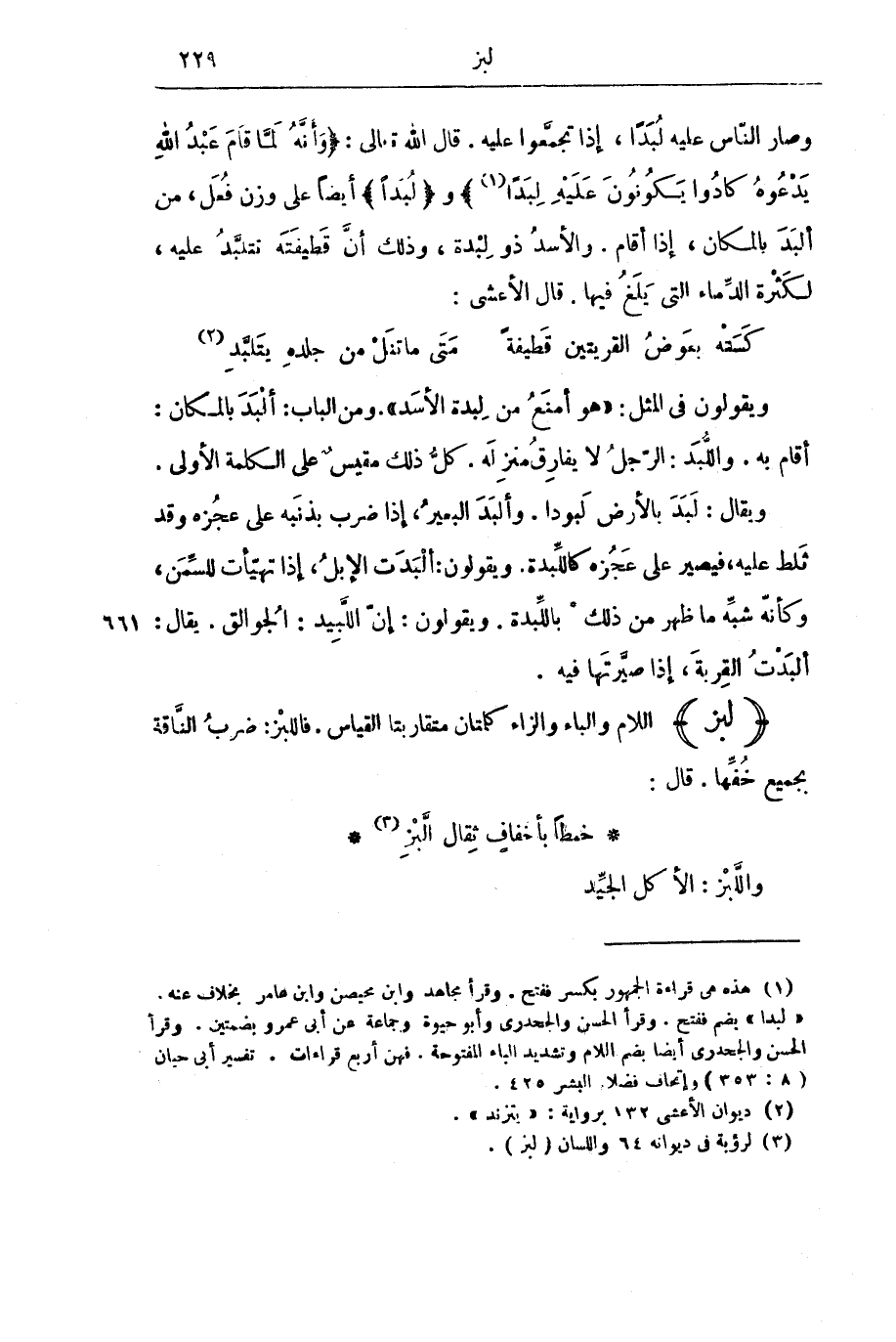 وَصَارَ النَّاسُ عَلَيْهِ لُبَدًا، إِذَا تَجَمَّعُوا عَلَيْهِ. قَالَ اللَّهُ تَعَالَى: {وَأَنَّهُ لَمَّا قَامَ عَبْدُ اللَّهِ يَدْعُوهُ كَادُوا يَكُونُونَ عَلَيْهِ لِبَدًا} [الجن: 19] . وَ (لُبَدٌا) أَيْضًا عَلَى وَزْنٍ فُعَلٍ، مِنْ أَلَبَدَ بِالْمَكَانِ، إِذَا أَقَامَ، وَالْأَسَدُ ذُو لِبْدَةٍ، وَذَلِكَ أَنَّ قَطِيفَتَهُ تَتَلَبَّدُ عَلَيْهِ، لِكَثْرَةِ الدِّمَاءِ الَّتِي يَلَغُ فِيهَا. قَالَ الْأَعْشَى: