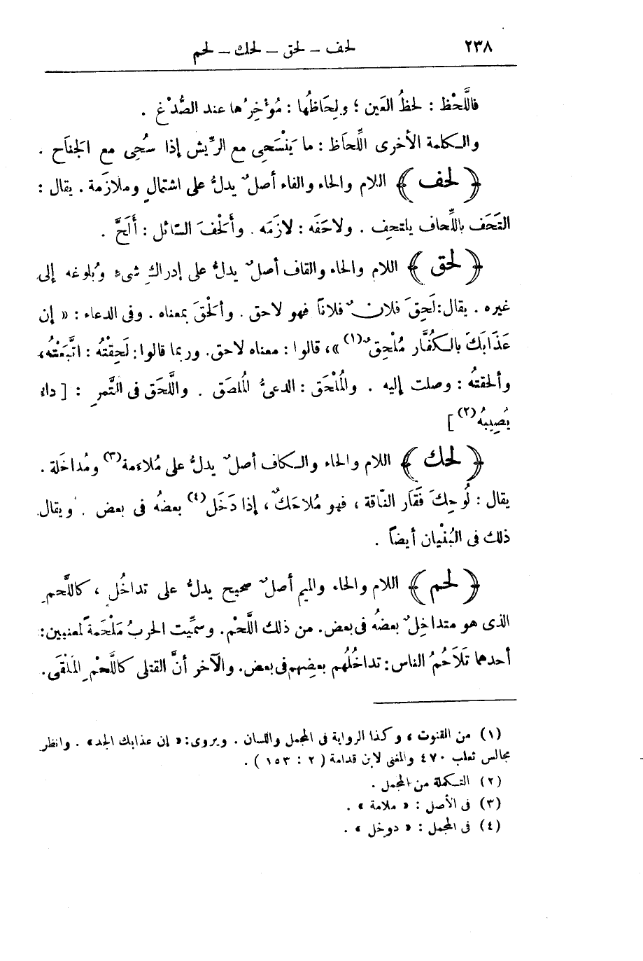 (لَحَمَ) اللَّامُ وَالْحَاءُ وَالْمِيمُ أَصْلٌ صَحِيحٌ يَدُلُّ عَلَى تَدَاخُلٍ، كَاللَّحْمِ الَّذِي هُوَ مُتَدَاخِلٌ بَعْضُهُ فِي بَعْضٍ. مِنْ ذَلِكَ اللَّحْمُ. وَسُمِّيَتِ الْحَرْبُ مَلْحَمَةً لِمَعْنَيَيْنِ: أَحَدُهُمَا تَلَاحُمُ النَّاسِ: تَدَاخُلُهُمْ بَعْضِهِمْ فِي بَعْضٍ. وَالْآخَرُ أَنَّ الْقَتْلَى كَاللَّحْمِ الْمُلْقَى.