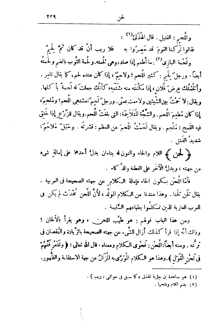 فَأَمَّا اللَّحْنُ بِسُكُونِ الْحَاءِ فَإِمَالَةُ الْكَلَامِ عَنْ جِهَتِهِ الصَّحِيحَةِ فِي الْعَرَبِيَّةِ. يُقَالُ لَحَنَ لَحْنًا. وَهَذَا عِنْدَنَا مِنَ الْكَلَامِ الْمُوَلَّدِ، لِأَنَّ اللَّحْنَ مُحْدَثٌ لَمْ يَكُنْ فِي الْعَرَبِ الْعَارِبَةِ الَّذِينَ تَكَلَّمُوا بِطِبَاعِهِمُ السَّلِيمَةِ. وَمِنْ هَذَا الْبَابِ قَوْلُهُمْ: هُوَ طَيِّبُ اللَّحْنِ، وَهُوَ يَقْرَأُ بِالْأَلْحَانِ; وَذَلِكَ أَنَّهُ إِذَا قَرَأَ كَذَلِكَ أَزَالَ الشَّيْءَ عَنْ جِهَتِهِ الصَّحِيحَةِ بِالزِّيَادَةِ وَالنُّقْصَانِ فِي تَرَنُّمِهِ. وَمِنْهُ أَيْضًا: اللَّحْنُ: فَحْوَى الْكَلَامِ وَمَعْنَاهُ. قَالَ اللَّهُ تَعَالَى: {وَلَتَعْرِفَنَّهُمْ فِي لَحْنِ الْقَوْلِ} [محمد: 30] . وَهَذَا هُوَ الْكَلَامُ الْمُوَرَّى بِهِ الْمُزَالُ عَنْ جِهَةِ الِاسْتِقَامَةِ وَالظُّهُورِ.
