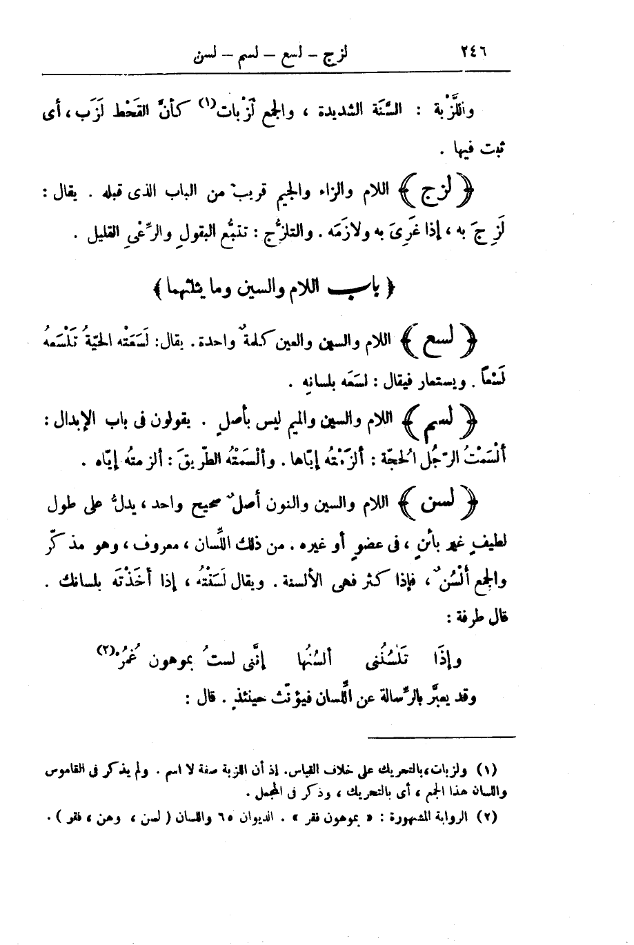 (لَسَنَ) اللَّامُ وَالسِّينُ وَالنُّونُ أَصْلٌ صَحِيحٌ وَاحِدٌ، يَدُلُّ عَلَى طُولٍ لَطِيفٍ غَيْرِ بَائِنٍ، فِي عُضْوٍ أَوْ غَيْرِهِ. مِنْ ذَلِكَ اللِّسَانُ، مَعْرُوفٌ، وَهُوَ مُذَكَّرٌ وَالْجَمْعُ أَلْسُنٌ، فَإِذَا كَثُرَ فَهِيَ الْأَلْسِنَةُ. وَيُقَالُ لَسَنْتُهُ، إِذَا أَخَذْتَهُ بِلِسَانِكَ. قَالَ طَرَفَةُ: