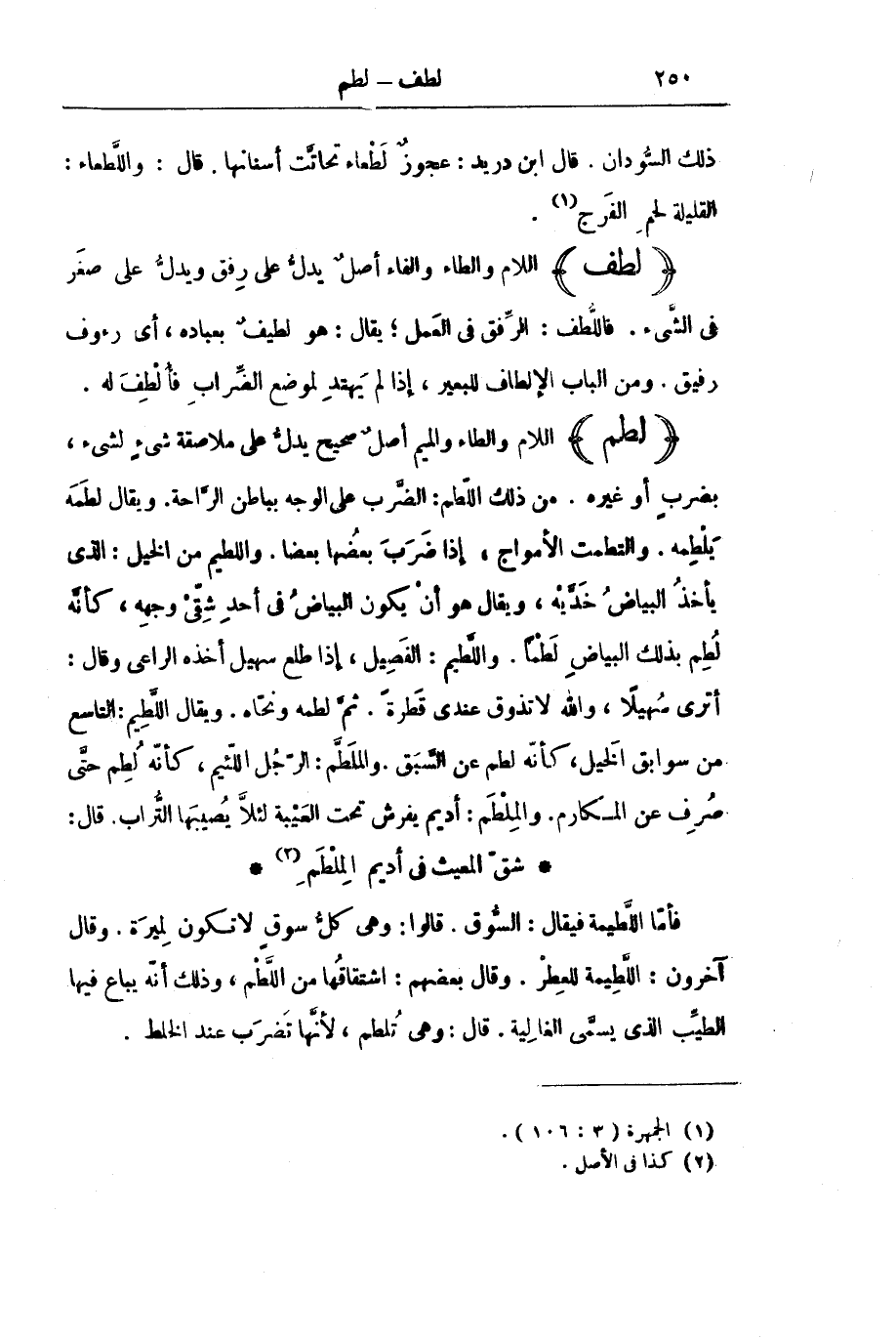 (لَطَمَ) اللَّامُ وَالطَّاءُ وَالْمِيمُ أَصْلٌ صَحِيحٌ يَدُلُّ عَلَى مُلَاصَقَةِ شَيْءٍ لِشَيْءٍ، بِضَرْبٍ أَوْ غَيْرِهِ. مِنْ ذَلِكَ اللَّطْمُ: الضَّرْبُ عَلَى الْوَجْهِ بِبَاطِنِ الرَّاحَةِ. وَيُقَالُ لَطَمَهُ يَلْطِمُهُ. وَالْتَطَمَتِ الْأَمْوَاجُ، إِذَا ضَرَبَ بَعْضُهَا بَعْضًا. وَاللَّطِيمُ مِنَ الْخَيْلِ: الَّذِي يَأْخُذُ الْبَيَاضُ خَدَّيْهِ، وَيُقَالُ هُوَ أَنْ يَكُونَ الْبَيَاضُ فِي أَحَدِ شِقَّيْ وَجْهِهِ، كَأَنَّهُ لُطِمَ بِذَلِكَ الْبَيَاضِ لَطْمًا. وَاللَّطِيمُ: الْفَصِيلُ، إِذَا طَلَعَ سُهَيْلٌ أَخَذَهُ الرَّاعِي وَقَالَ: أَتَرَى سُهَيْلًا، وَاللَّهِ لَا تَذُوقُ عِنْدِي قَطْرَةً. ثُمَّ لَطَمَهُ وَنَحَّاهُ. وَيُقَالُ اللَّطِيمُ: التَّاسِعُ مِنْ سَوَابِقِ الْخَيْلِ، كَأَنَّهُ لُطِمَ عَنِ السَّبَقِ. وَالْمُلَطَّمُ: الرَّجُلُ اللَّئِيمُ، كَأَنَّهُ لُطِمَ حَتَّى صُرِفَ عَنِ الْمَكَارِمِ. وَالْمِلْطَمُ: أَدِيمٌ يُفْرَشُ تَحْتَ الْعَيْبَةِ لِئَلَّا يُصِيبَهَا التُّرَابُ. قَالَ: