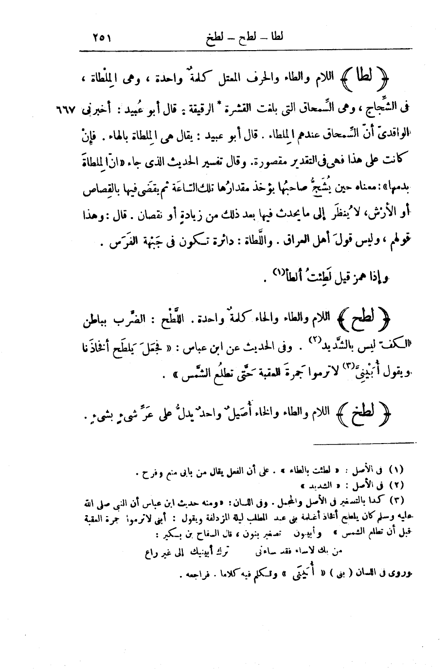 (لَطَحَ) اللَّامُ وَالطَّاءُ وَالْحَاءُ كَلِمَةٌ وَاحِدَةٌ. اللَّطْحُ: الضَّرْبُ بِبَاطِنِ الْكَفِّ لَيْسَ بِالشَّدِيدِ. وَفِي الْحَدِيثِ عَنِ ابْنِ عَبَّاسٍ: " «فَجَعَلَ يَلْطَحُ أَفْخَاذَنَا وَيَقُولُ أُبَيْنِيَّ لَا تَرْمُوا جَمْرَةَ الْعَقَبَةِ حَتَّى تَطْلُعَ الشَّمْسُ» ".