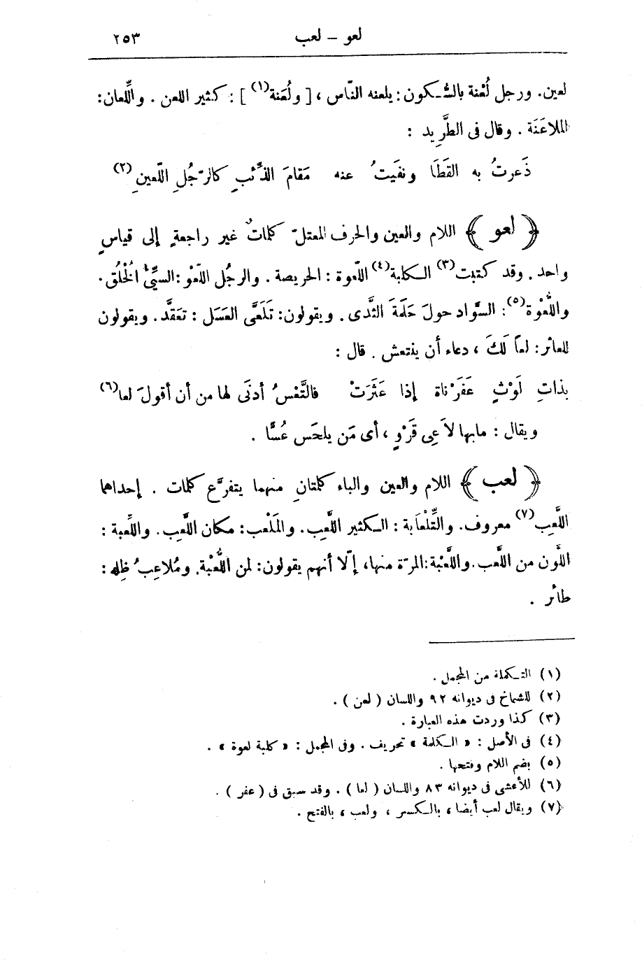 (لَعَوَ) اللَّامُ وَالْعَيْنُ وَالْحَرْفُ الْمُعْتَلُّ كَلِمَاتٌ غَيْرُ رَاجِعَةٍ إِلَى قِيَاسٍ وَاحِدٍ. وَقَدْ كُتِبَتِ الْكَلْبَةُ اللَّعْوَةُ: الْحَرِيصَةُ. وَالرَّجُلُ اللَّعْوُ: السَّيِّئُ الْخُلُقِ. وَاللُّعْوَةُ: السَّوَادُ حَوْلَ حَلَمَةِ الثَّدْيِ. وَيَقُولُونَ: تَلَعَّى الْعَسَلُ: تَعَقَّدَ. وَيَقُولُونَ لِلْعَاثِرِ: لَعَا لَكَ، دُعَاءٌ أَنْ يَنْتَعِشَ. قَالَ: