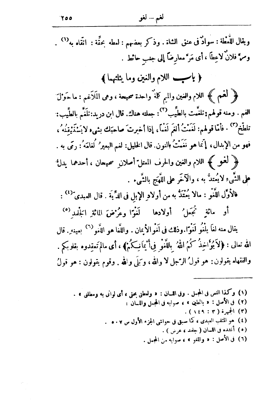 (لَغَوَ) اللَّامُ وَالْغَيْنُ وَالْحَرْفُ الْمُعْتَلُّ أَصْلَانِ صَحِيحَانِ، أَحَدُهُمَا يَدُلُّ عَلَى الشَّيْءِ لَا يُعْتَدُّ بِهِ، وَالْآخَرُ عَلَى اللَّهَجِ بِالشَّيْءِ.