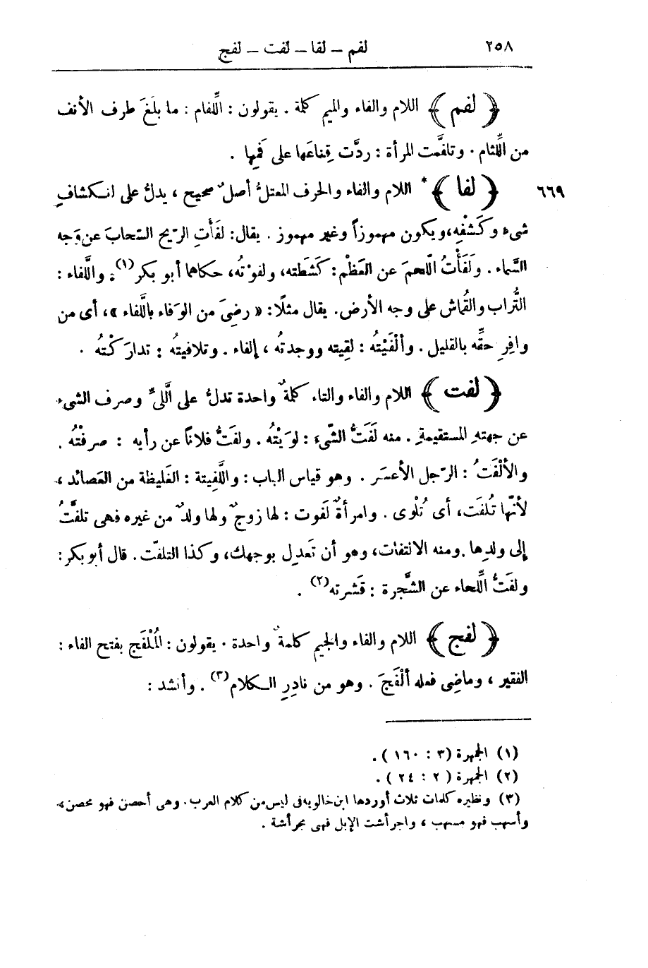 (لَفَتَ) اللَّامُ وَالْفَاءُ وَالتَّاءُ كَلِمَةٌ وَاحِدَةٌ تَدُلُّ عَلَى اللَّيِّ وَصَرْفِ الشَّيْءِ عَنْ جِهَتِهِ الْمُسْتَقِيمَةِ. مِنْهُ لَفَتُّ الشَّيْءَ: لَوَيْتُهُ. وَلَفَتُّ فُلَانًا عَنْ رَأْيِهِ: صَرَفْتُهُ. وَالْأَلْفَتُ: الرَّجُلُ الْأَعْسَرُ. وَهُوَ قِيَاسُ الْبَابِ: وَاللَّفِيتَةُ: الْغَلِيظَةُ مِنَ الْعَصَائِدِ، لِأَنَّهَا تُلْفَتُ، أَيْ تُلْوَى. وَامْرَأَةٌ لَفُوتٌ: لَهَا زَوْجٌ وَلَهَا وَلَدٌ مِنْ غَيْرِهِ فَهِيَ تَلْفِتُ إِلَى وَلَدِهَا. وَمِنْهُ الِالْتِفَاتُ، وَهُوَ أَنْ تَعْدِلَ بِوَجْهِكَ، وَكَذَا التَّلَفُّتُ. قَالَ أَبُو بَكْرٍ: وَلَفَتُّ اللِّحَاءَ مِنَ الشَّجَرَةِ: قَشَرْتُهُ.