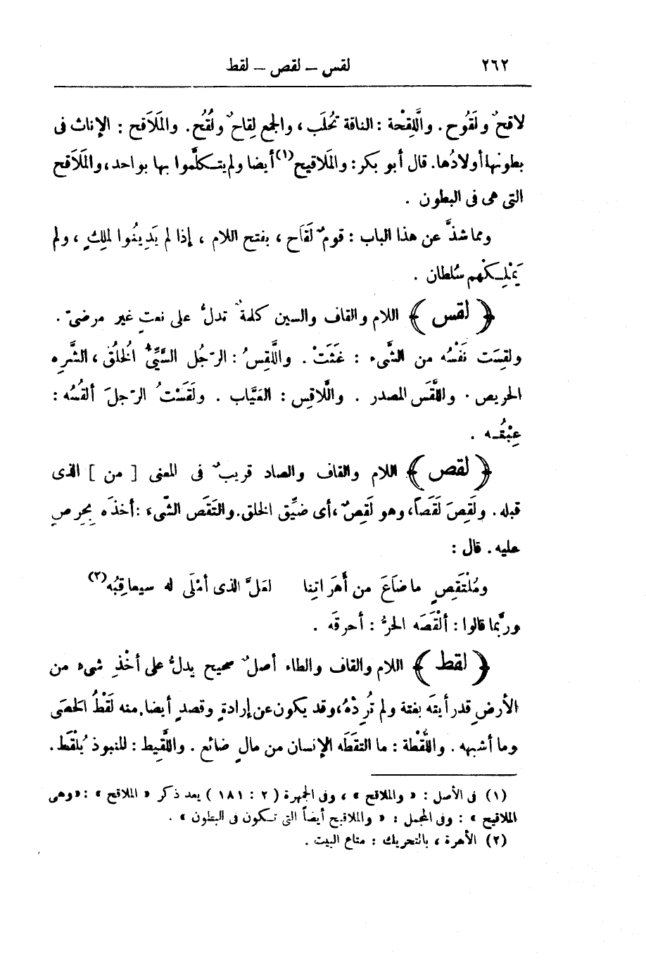 (لَقَطَ) اللَّامُ وَالْقَافُ وَالطَّاءُ أَصْلٌ صَحِيحٌ يَدُلُّ عَلَى أَخْذِ شَيْءٍ مِنَ الْأَرْضِ قَدْ رَأَيْتَهُ بَغْتَةً وَلَمْ تُرِدْهُ، وَقَدْ يَكُونُ عَنْ إِرَادَةٍ وَقَصْدٍ أَيْضًا. مِنْهُ لَقْطُ الْحَصَى وَمَا أَشْبَهَهُ وَاللُّقْطَةُ: مَا الْتَقَطَهُ الْإِنْسَانُ مِنْ مَالٍ ضَائِعٍ. وَاللَّقِيطُ: الْمَنْبُوذُ يُلْقَطُ.