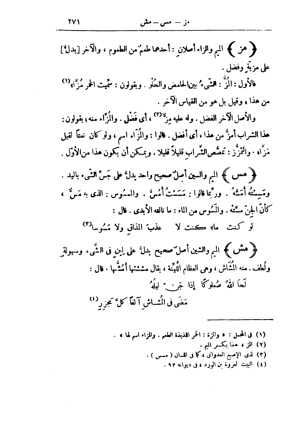 فَالْأَوَّلُ: الْمُزُّ: الشَّيْءُ بَيْنَ الْحَامِضِ وَالْحُلْوِ. وَيَقُولُونَ: سُمِّيَتِ الْخَمْرُ مُزَّاءً مِنْ هَذَا، وَقِيلَ بَلْ هُوَ مِنَ الْقِيَاسِ الْآخَرِ. وَالْأَصْلُ الْآخَرُ الْفَضْلُ. وَلَهُ عَلَيْهِ مِزٌّ، أَيْ فَضْلٌ. وَالْمُزَّاءُ مِنْهُ ; يَقُولُونَ: هَذَا الشَّرَابُ أَمَزُّ مِنْ هَذَا، أَيْ أَفْضَلُ. قَالُوا: وَالْمُزَّاءُ اسْمٌ، وَلَوْ كَانَ نَعْتًا لَقِيلَ مَزَّاءُ. وَالتَّمَزُّزُ: تَمَصُّصُ الشَّرَابِ قَلِيلًا قَلِيلًا. وَيُمْكِنُ أَنْ يَكُونَ هَذَا مِنَ الْأَوَّلِ.
