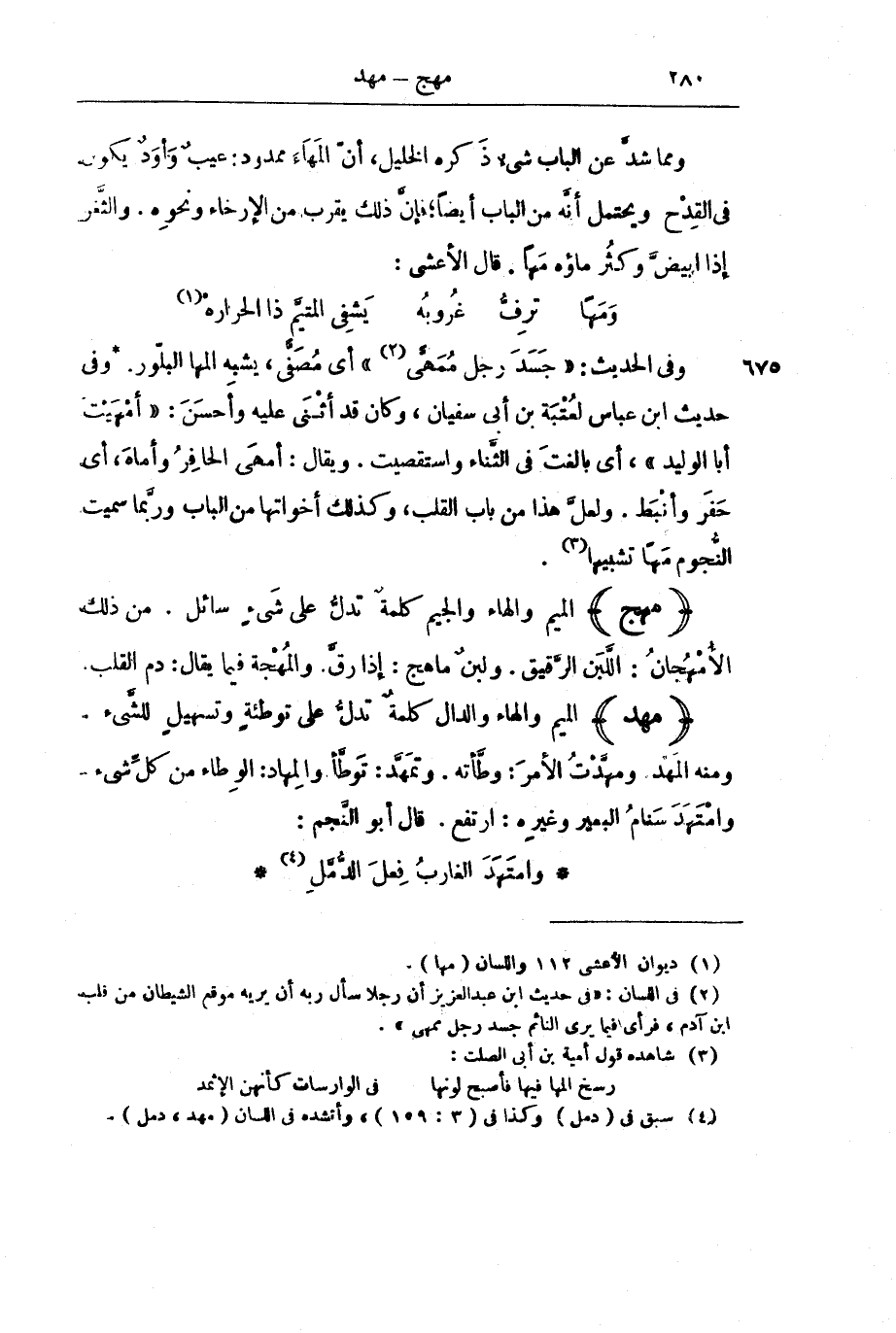 وَفِي الْحَدِيثِ: " «جَسَدَ رَجُلٍ مُمَهًّى» " أَيْ مُصَفًّى، يُشْبِهُ الْمَهَا الْبِلَّوْرَ. وَفِي حَدِيثِ ابْنِ عَبَّاسٍ لِعُتْبَةَ بْنِ أَبِي سُفْيَانَ، وَكَانَ قَدْ أَثْنَى عَلَيْهِ وَأَحْسَنَ: «أَمْهَيْتَ أَبَا الْوَلِيدِ» ، أَيْ بَالَغْتَ فِي الثَّنَاءِ وَاسْتَقْصَيْتَ. وَيُقَالُ: أَمْهَى الْحَافِرُ وَأَمَاهَ، أَيْ حَفَرَ وَأَنْبَطَ.