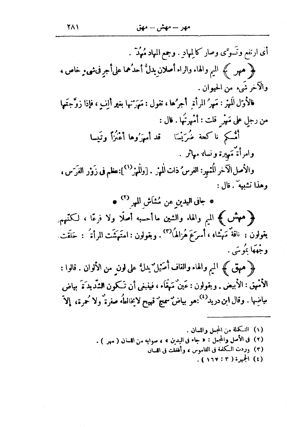 فَالْأَوَّلُ الْمَهْرُ: مَهْرُ الْمَرْأَةِ أَجْرُهَا، تَقُولُ: مَهَرْتُهَا بِغَيْرِ أَلِفٍ، فَإِذَا زَوَّجْتَهَا مِنْ رَجُلٍ عَلَى مَهْرٍ قُلْتَ: أَمْهَرْتُهَا. قَالَ: