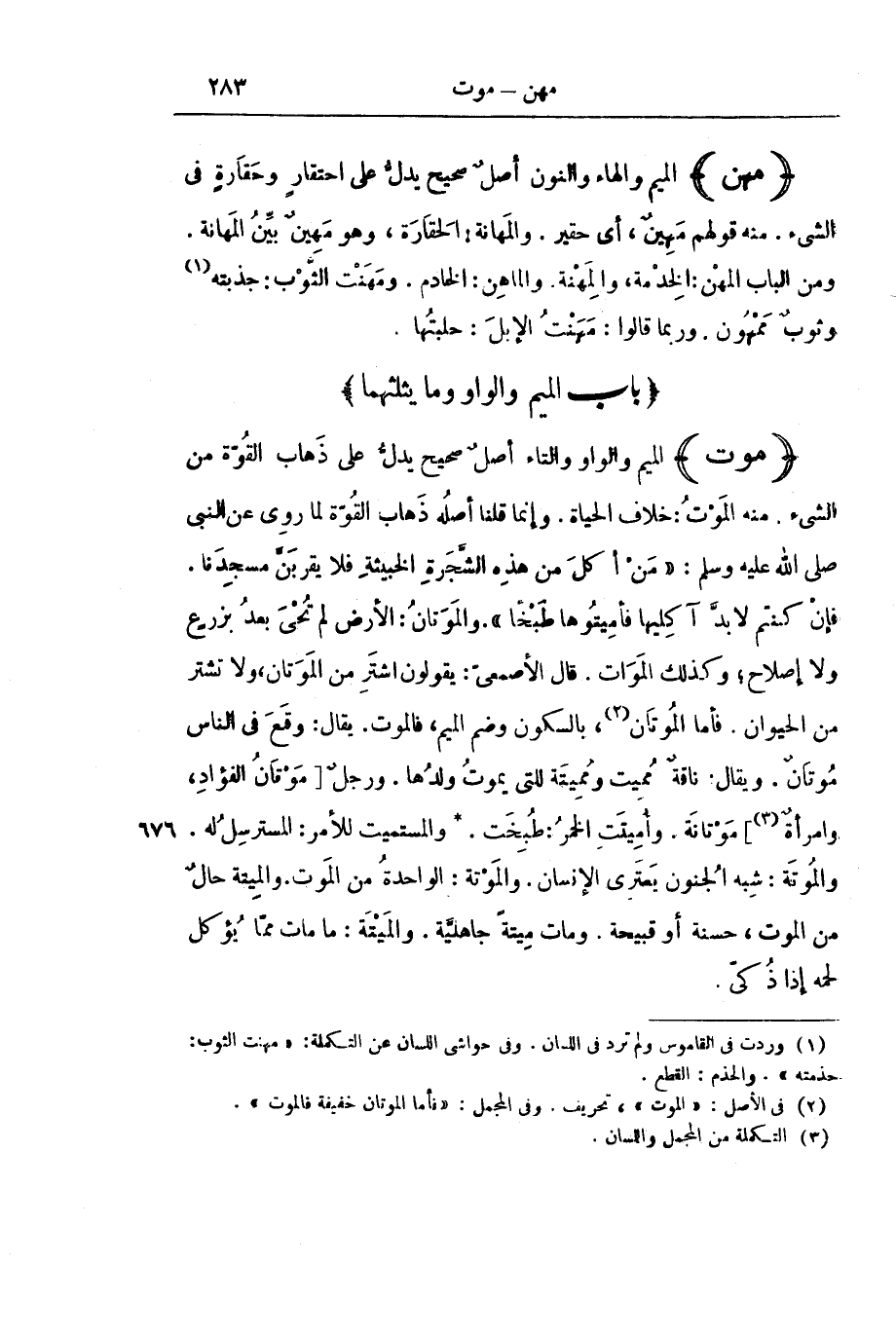 مِنْهُ الْمَوْتُ: خِلَافُ الْحَيَاةِ، وَإِنَّمَا قُلْنَا: أَصْلُهُ ذَهَابُ الْقُوَّةِ، لِمَا رُوِيَ عَنِ النَّبِيِّ صَلَّى اللَّهُ عَلَيْهِ وَسَلَّمَ: «مَنْ أَكَلَ مِنْ هَذِهِ الشَّجَرَةِ الْخَبِيثَةِ فَلَا يَقْرَبَنَّ مَسْجِدَنَا، فَإِنْ كُنْتُمْ لَا بُدَّ آكِلِيهَا فَأَمِيتُوهَا طَبْخًا» وَالْمَوَتَانُ: الْأَرْضُ لَمْ تُحْيَ بَعْدُ بِزَرْعٍ وَلَا إِصْلَاحٍ، وَكَذَلِكَ الْمَوَاتُ: قَالَ الْأَصْمَعِيُّ: يَقُولُونَ اشْتَرِ مِنَ الْمَوَتَانِ، وَلَا تَشْتَرِ مِنَ الْحَيَوَانِ. فَأَمَّا الْمُوَتَانِ، بِالسُّكُونِ وَضَمِّ الْمِيمِ، فَالْمَوْتُ، يُقَالُ: وَقَعَ فِي النَّاسِ مُوتَانٌ، وَيُقَالُ: نَاقَةٌ مُمِيتٌ وَمُمِيتَةٌ لِلَّتِي يَمُوتُ وَلَدُهَا ; وَرَجُلٌ [مَوْتَانُ الْفُؤَادِ، وَامْرَأَةٌ] مَوْتَانَةٌ، وَأُمِيتَتِ الْخَمْرُ: طُبِخَتْ. وَالْمُسْتَمِيتُ لِلْأَمْرِ: الْمُسْتَرْسِلُ لَهُ. وَالْمُوتَةُ: شِبْهُ الْجُنُونِ يَعْتَرِى الْإِنْسَانَ، وَالْمَوْتَةُ: الْوَاحِدَةُ مِنَ الْمَوْتِ، وَالْمِيتَةُ حَالٌ مِنَ الْمَوْتِ، حَسَنَةٌ أَوْ قَبِيحَةٌ ; وَمَاتَ مِيتَةً جَاهِلِيَّةً: وَالْمَيْتَةُ: مَا مَاتَ مِمَّا يُؤْكَلُ لَحْمُهُ إِذَا ذُكِّيَ.