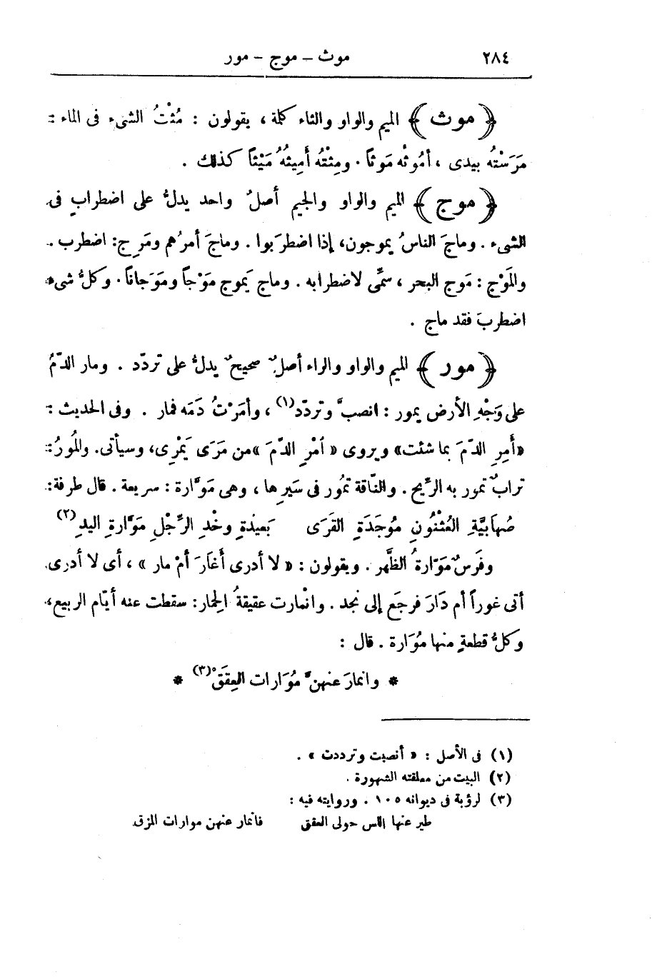 (مَوَرَ) الْمِيمُ وَالْوَاوُ وَالرَّاءُ أَصْلٌ صَحِيحٌ يَدُلُّ عَلَى تَرَدُّدٍ. وَمَارَ الدَّمُ عَلَى وَجْهِ الْأَرْضِ يَمُورُ: انْصَبَّ وَتَرَدَّدَ، وَأَمَرْتُ دَمَهُ فَمَارَ، وَفِي الْحَدِيثِ: «أَمِرِ الدَّمَ بِمَا شِئْتَ» " وَيُرْوَى " «أَمْرِ الدَّمَ» " مِنْ مَرَى يَمْرِي، وَسَيَأْتِي ; وَالْمُورُ: تُرَابٌ تَمُورُ بِهِ الرِّيحُ، وَالنَّاقَةُ تَمُورُ فِي سَيْرِهَا، وَهِيَ مَوَّارَةٌ: سَرِيعَةٌ، قَالَ طَرَفَةُ: