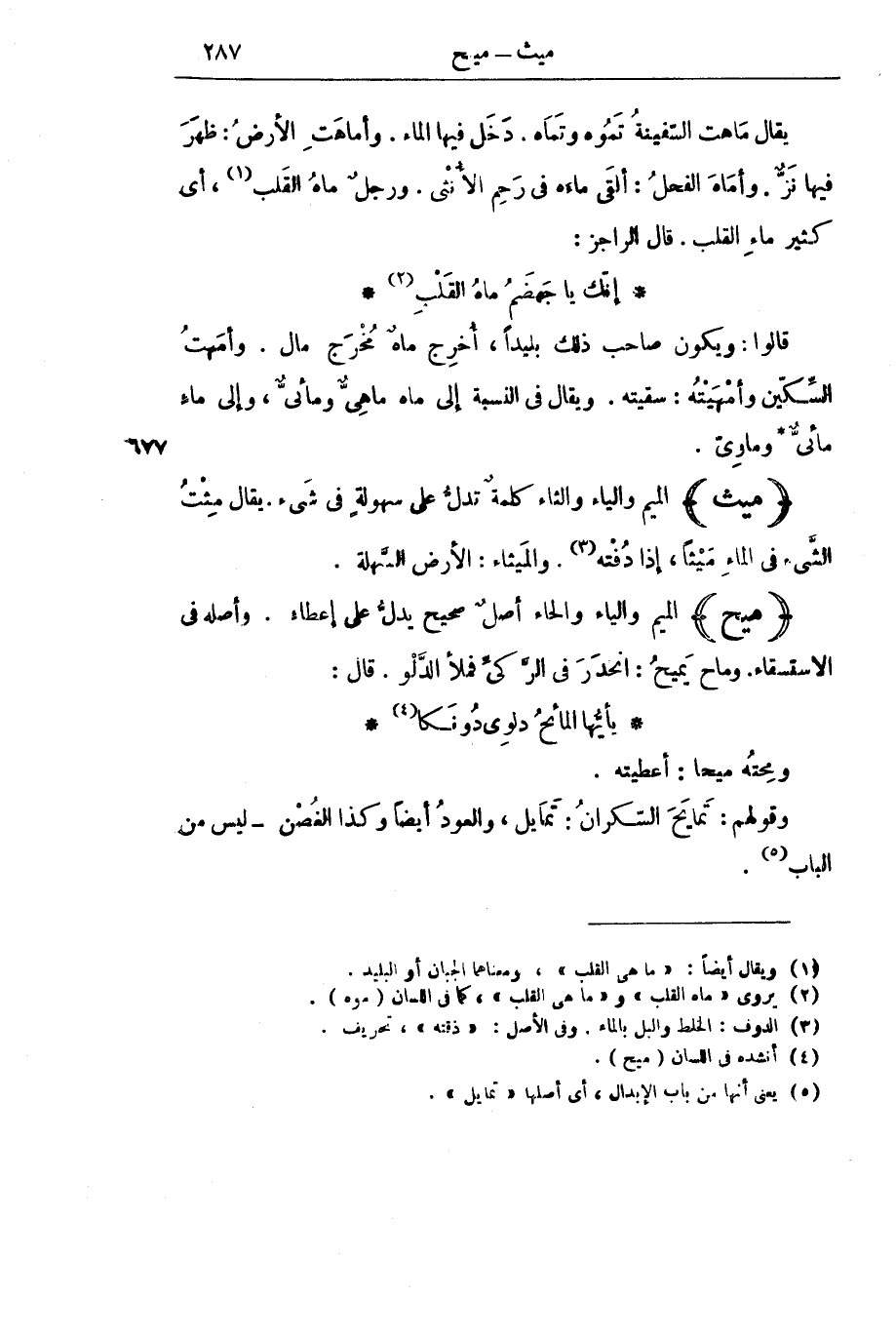 يُقَالُ مَاهَتِ السَّفِينَةُ تَمُوهُ وَتَمَاهُ: دَخَلَ فِيهَا الْمَاءُ، وَأَمَاهَتِ الْأَرْضُ: ظَهَرَ فِيهَا نَزٌّ، وَأَمَاهَ الْفَحْلُ: أَلْقَى مَاءَهُ فِي رَحِمِ الْأُنْثَى ; وَرَجُلٌ مَاهُ الْقَلْبِ، أَيْ كَثِيرُ مَاءِ الْقَلْبِ، قَالَ الرَّاجِزُ: