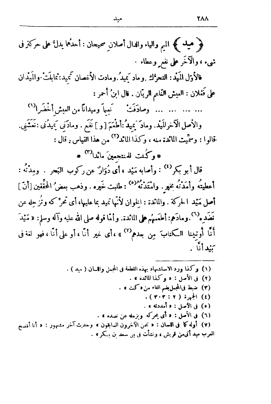 قَالَ أَبُو بَكْرٍ: وَأَصَابَهُ مَيْدٌ، أَيْ دُوَارٌ عَنْ رُكُوبِ الْبَحْرِ. وَمِدْتُهُ: أَعْطَيْتُهُ وَأَمَدْتُهُ بِخَيْرٍ. وَامْتَدْتُهُ: طَلَبْتُ خَيْرَهُ. وَذَهَبَ بَعْضُ الْمُحَقِّقِينَ [أَنَّ] أَصْلَ مَيْدٍ الْحَرَكَةُ. وَالْمَائِدَةُ: الْخِوَانُ لِأَنَّهَا تَمِيدُ بِمَا عَلَيْهَا، أَيْ تُحَرِّكُهُ وَتُزْحِلُهُ عَنْ نَضَدِهِ. وَمَادَهُمْ: أَطْعَمَهُمْ عَلَى الْمَائِدَةِ. وَأَمَّا قَوْلُهُ صَلَّى اللَّهُ عَلَيْهِ وَآلِهِ وَسَلَّمَ: " «مَيْدَ أَنَّا أُوتِينَا الْكِتَابَ مِنْ بَعْدِهِمْ» "، أَيْ غَيْرَ أَنَّا، أَوْ عَلَى أَنَّا، فَهُوَ لُغَةٌ فِي بَيْدَ أَنَّا.