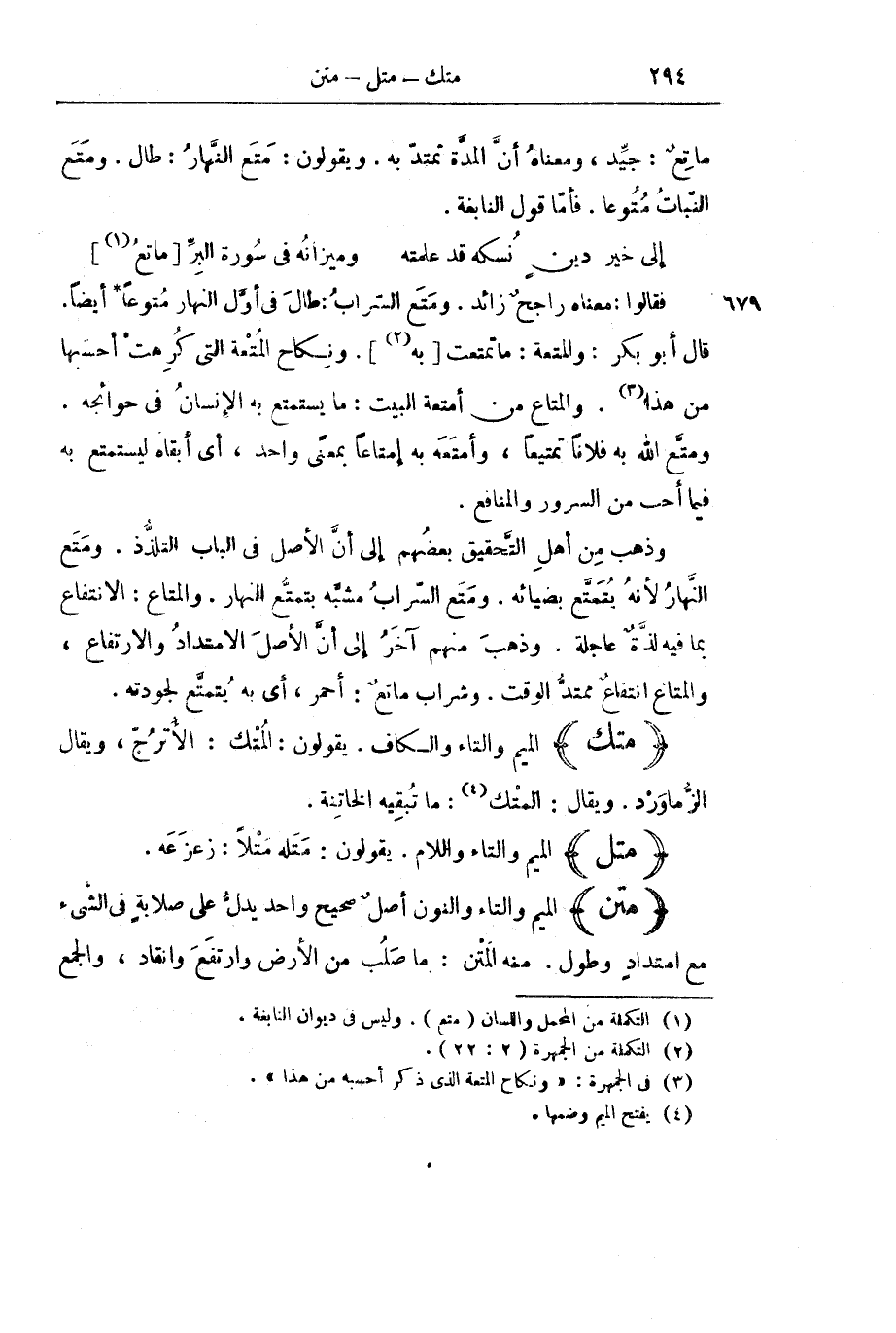 وَذَهَبَ مِنْ أَهْلِ التَّحْقِيقِ بَعْضُهُمْ إِلَى أَنَّ الْأَصْلَ فِي الْبَابِ التَّلَذُّذُ. وَمَتَعَ النَّهَارُ لِأَنَّهُ يُتَمَتَّعُ بِضِيَائِهِ. وَمَتَّعَ السَّرَابُ مُشَبَّهٌ بِتَمَتُّعِ النَّهَارِ. وَالْمَتَاعُ: الِانْتِفَاعُ بِمَا فِيهِ لَذَّةٌ عَاجِلَةٌ.