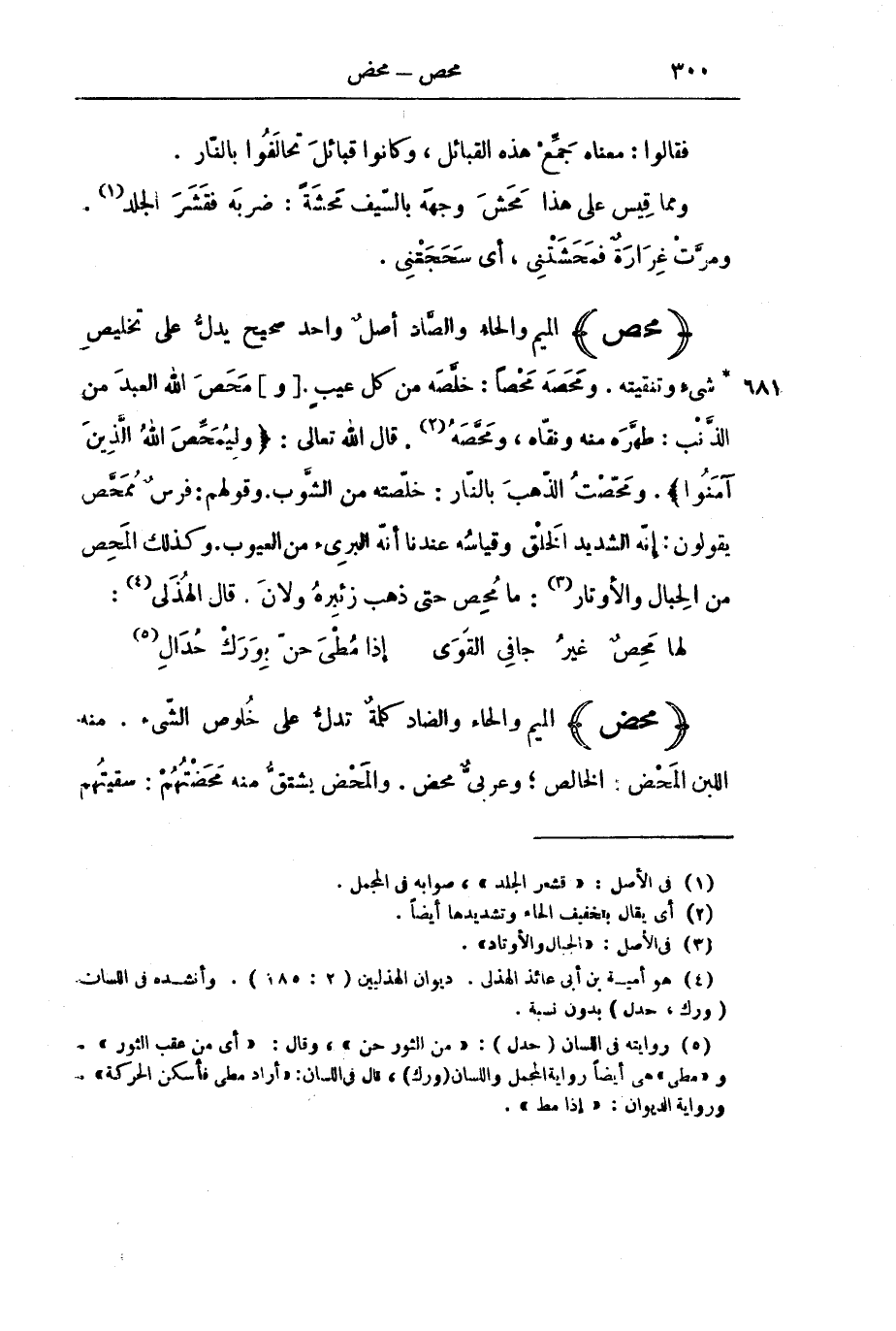 (مَحَصَ) الْمِيمُ وَالْحَاءُ وَالصَّادُ أَصْلٌ وَاحِدٌ صَحِيحٌ يَدُلُّ عَلَى تَخْلِيصِ شَيْءٍ وَتَنْقِيَتِهِ. وَمَحَصَهُ مَحْصًا: خَلَّصَهُ مِنْ كُلِّ عَيْبٍ. [وَ] مَحَصَ اللَّهُ الْعَبْدَ مِنَ الذَّنْبِ: طَهَّرَهُ مِنْهُ وَنَقَّاهُ، وَمَحَّصَهُ. قَالَ اللَّهُ تَعَالَى: {وَلِيُمَحِّصَ اللَّهُ الَّذِينَ آمَنُوا} [آل عمران: 141] . وَمَحَّصْتُ الذَّهَبَ بِالنَّارِ: خَلَّصْتُهُ مِنَ الشَّوْبِ. وَقَوْلُهُمْ: فَرَسٌ مُمَحَّصٌ يَقُولُونَ: إِنَّهُ الشَّدِيدُ الْخَلْقِ وَقِيَاسُهُ عِنْدَنَا أَنَّهُ الْبَرِيءُ مِنَ الْعُيُوبِ، وَكَذَلِكَ الْمَحِصُ مِنَ الْحِبَالِ وَالْأَوْتَارِ: مَا مُحِصَ حَتَّى ذَهَبَ زِئْبِرُهُ وَلَانَ. قَالَ الْهُذَلِيُّ: