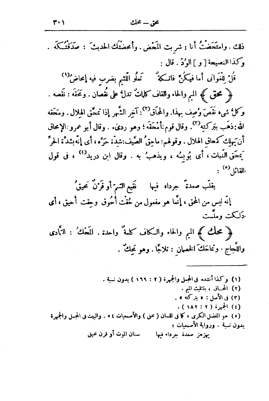 (مَحَقَ) الْمِيمُ وَالْحَاءُ وَالْقَافُ كَلِمَاتٌ تَدُلُّ عَلَى نُقْصَانٍ. وَمَحَقَهُ: نَقَصَهُ. وَكُلُّ شَيْءٍ نَقَصَ وُصِفَ بِهَذَا. وَالْمَُِحَاقُ: آخِرُ الشَّهْرِ إِذَا تَمَحَّقَ الْهِلَالُ. وَمَحَقَهُ اللَّهُ: ذَهَبَ بِبَرَكَتِهِ. وَقَالَ قَوْمٌ: أَمْحَقَهُ ; وَهُوَ رَدِيءٌ. وَقَالَ أَبُو عَمْرٍو: الْإِمْحَاقُ أَنْ يَهْلِكَ كَمِحَاقِ الْهِلَالِ. وَقَوْلُهُمْ: مَاحِقُ الصَّيْفِ: شِدَّةُ حَرِّهِ، أَيْ إِنَّهُ بِشِدَّةِ الْحَرِّ يَمْحَقُ النَّبَاتَ، أَيْ يُوبِسُهُ، وَيَذْهَبُ بِهِ، وَقَالَ ابْنُ دُرَيْدٍ، فِي قَوْلِ الْقَائِلِ: