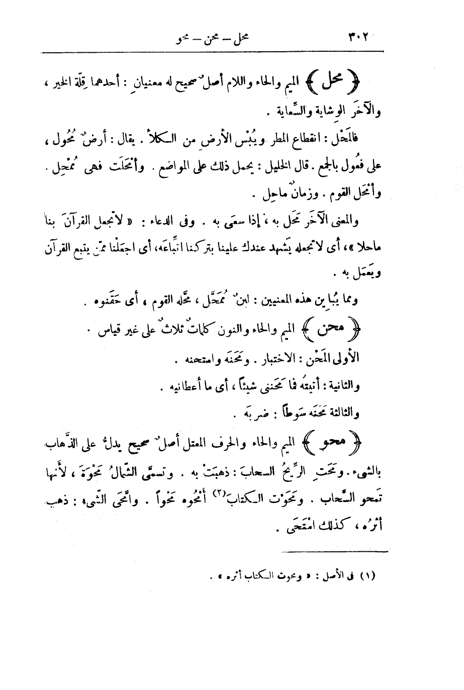 (مَحَوَ) الْمِيمُ وَالْحَاءُ وَالْحَرْفُ الْمُعْتَلُّ أَصْلٌ صَحِيحٌ يَدُلُّ عَلَى الذَّهَابِ بِالشَّيْءِ. وَمَحَتِ الرِّيحُ السَّحَابَ: ذَهَبَتْ بِهِ. وَتُسَمَّى الشَّمَالُ مَحْوَةً، لِأَنَّهَا تَمْحُو السَّحَابَ. وَمَحَوْتُ الْكِتَابَ أَمْحُوهُ مَحْوًا. وَامَّحَى الشَّيْءُ: ذَهَبَ أَثَرُهُ، كَذَلِكَ امْتَحَى.