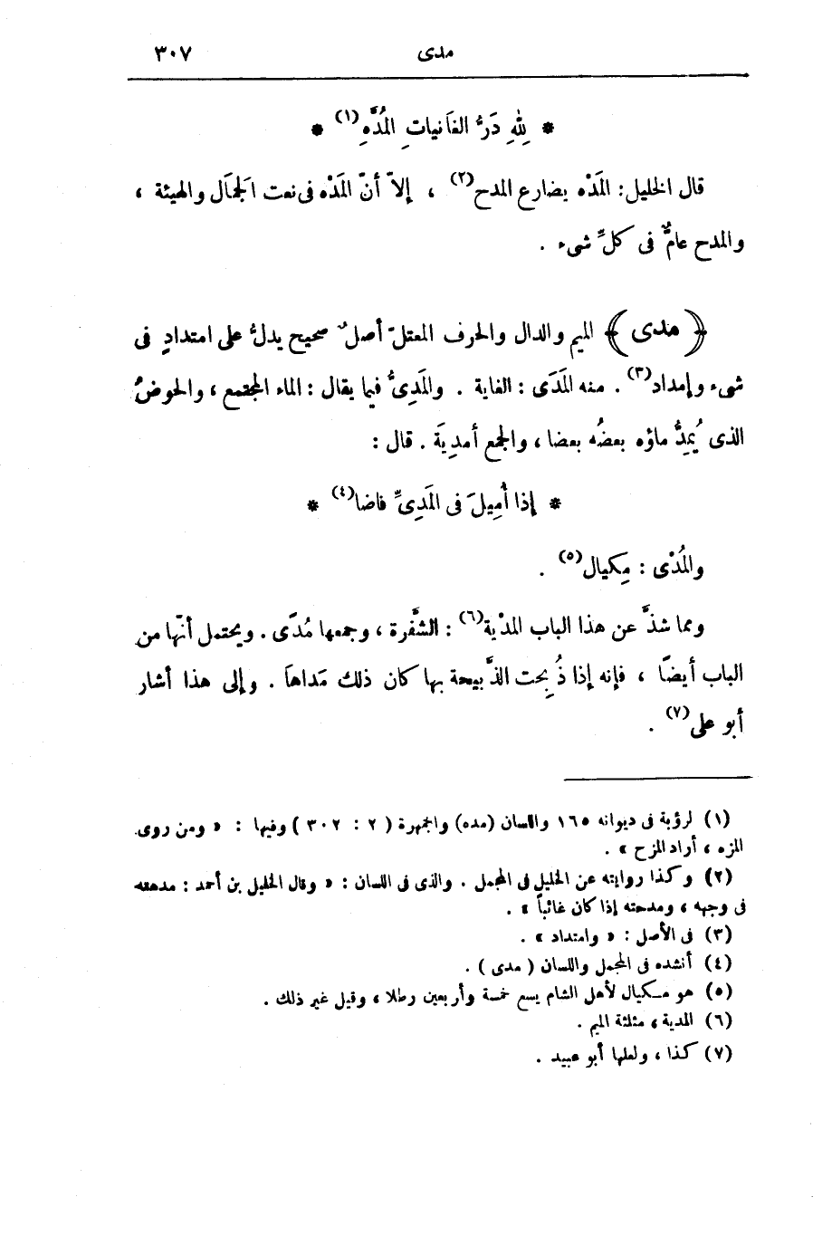 وَمِمَّا شَذَّ عَنْ هَذَا الْبَابِ الْمُدْيَةُ: الشَّفْرَةُ، وَجَمْعُهَا مُدًى. وَيُحْتَمَلُ أَنَّهَا مِنَ الْبَابِ أَيْضًا، فَإِنَّهُ إِذَا ذُبِحَتِ الذَّبِيحَةُ بِهَا كَانَ ذَلِكَ مَدَاهَا. وَإِلَى هَذَا أَشَارَ أَبُو عَلِيٍّ.
