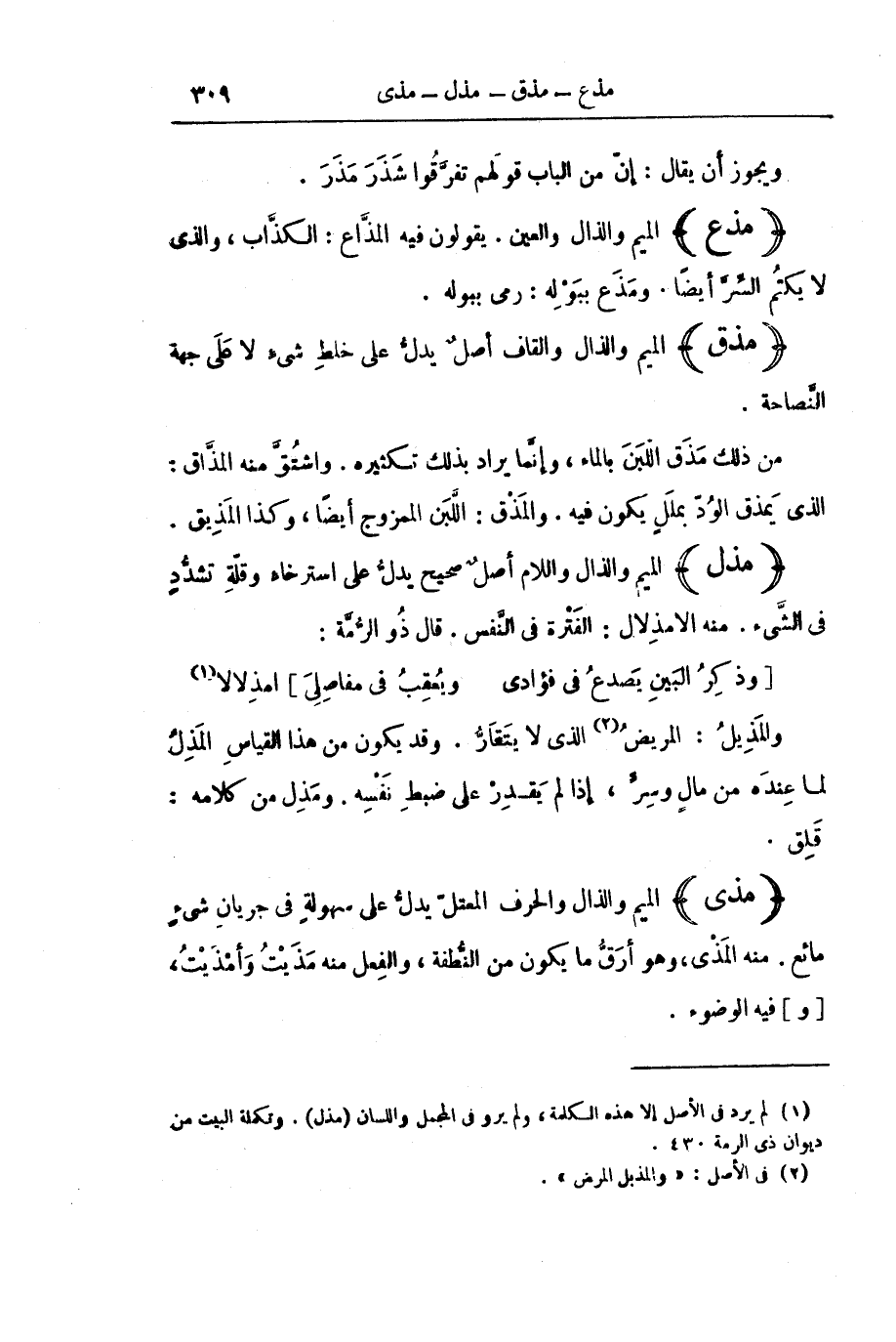 (مَذَلَ) الْمِيمُ وَالذَّالُ وَاللَّامُ أَصْلٌ صَحِيحٌ يَدُلُّ عَلَى اسْتِرْخَاءٍ وَقِلَّةِ تَشَدُّدٍ فِي الشَّيْءِ. مِنْهُ الِامْذِلَالُ: الْفَتْرَةُ فِي النَّفَسِ. قَالَ ذُو الرُّمَّةِ: