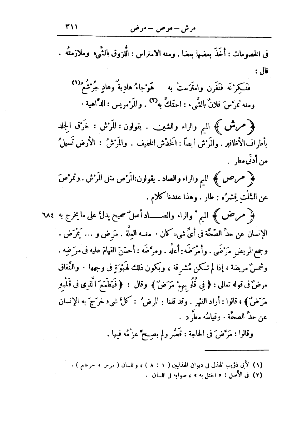 (مَرِضَ) الْمِيمُ وَالرَّاءُ وَالضَّادُ أَصْلٌ صَحِيحٌ يَدُلُّ عَلَى مَا يَخْرُجُ بِهِ الْإِنْسَانُ عَنْ حَدِّ الصِّحَّةِ فِي أَيِّ شَيْءٍ كَانَ. مِنْهُ الْعِلَّةُ. مَرِضَ وَ. . . يَمْرَضُ. وَجَمْعُ الْمَرِيضِ مَرْضَى. وَأَمْرَضَهُ: أَعَلَّهُ. وَمَرَّضَهُ: أَحْسَنَ الْقِيَامَ عَلَيْهِ فِي مَرَضِهِ. وَشَمْسٌ مَرِيضَةٌ، إِذَا لَمْ تَكُنْ مُشْرِقَةً، وَيَكُونُ ذَلِكَ لِهَبْوَةٍ فِي وَجْهِهَا. وَالنِّفَاقُ مَرَضٌ فِي قَوْلِهِ تَعَالَى: فِي قُلُوبِهِمْ مَرَضٌ وَقَالَ فَيَطْمَعَ الَّذِي فِي قَلْبِهِ مَرَضٌ، قَالُوا: أَرَادَ الْقَهْرَ. وَقَدْ قُلْنَا: الْمَرَضُ: كُلُّ شَيْءٍ خَرَجَ بِهِ الْإِنْسَانُ عَنْ حَدِّ الصِّحَّةِ. وَقِيَاسُهُ مُطَّرِدٌ.