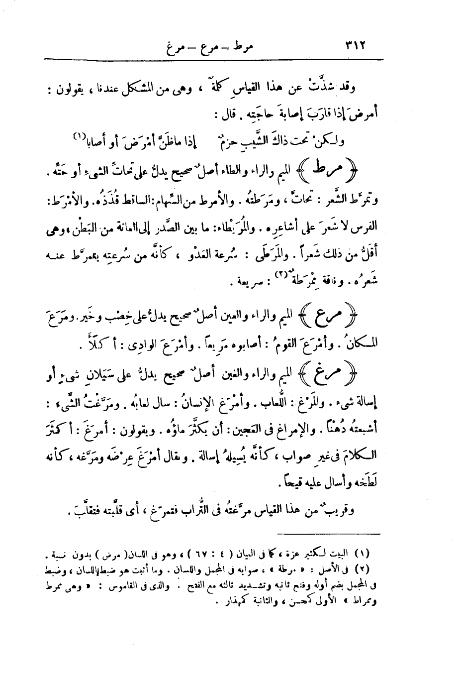 (مَرَغَ) الْمِيمُ وَالرَّاءُ وَالْغَيْنُ أَصْلٌ صَحِيحٌ يَدُلُّ عَلَى سَيَلَانِ شَيْءٍ أَوْ إِسَالَةِ شَيْءٍ. وَالْمَرْغُ: اللُّعَابُ. وَأَمْرَغَ الْإِنْسَانُ: سَالَ لُعَابُهُ. وَمَرَّغْتُ الشَّيْءَ: أَشْبَعْتُهُ دُهْنًا. وَالْإِمْرَاغُ فِي الْعَجِينِ: أَنْ يُكَثَّرَ مَاؤُهُ. وَيَقُولُونَ: أَمْرَغَ: أَكْثَرَ الْكَلَامَ فِي غَيْرِ صَوَابٍ، كَأَنَّهُ يُسِيلُهُ إِسَالَةً. وَيُقَالُ أَمْرَغَ عِرْضَهُ وَمَرَّغَهُ، كَأَنَّهُ لَطَخَهُ وَأَسَالَ عَلَيْهِ قَيْحًا.