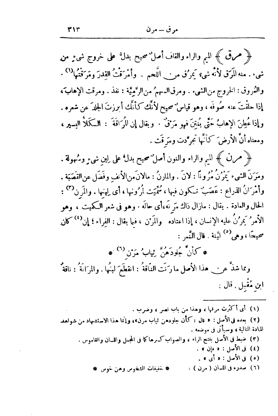 وَمِمَّا شَذَّ عَنْ هَذَا الْأَصْلِ مَارَنَتِ النَّاقَةُ: انْقَطَعَ لَبَنُهَا. وَالْمَرَانَةُ: نَاقَةُ ابْنِ مُقْبِلٍ. قَالَ: