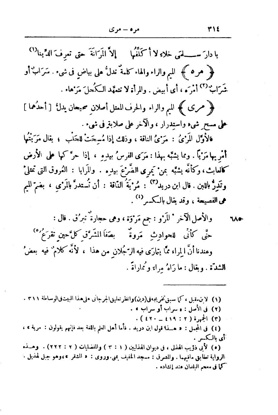 فَالْأَوَّلُ الْمَرْيُ: مَرْيُ النَّاقَةِ، وَذَلِكَ إِذَا مُسِحَتْ لِلْحَلْبِ، يُقَالُ مَرَيْتُهَا أَمْرِيهَا مَرْيًا. وَمِمَّا يُشَبَّهُ بِهَذَا: مَرَى الْفَرَسُ بِيَدِهِ، إِذَا حَرَّكَهَا عَلَى الْأَرْضِ كَالْعَابِثِ، وَكَأَنَّهُ يُشَبَّهُ بِمَنْ يَمْرِي الضَّرْعَ بِيَدِهِ. وَالْمَرَايَا: الْعُرُوقُ الَّتِي تَمْتَلِئُ وَتَدِرُّ بِاللَّبَنِ. قَالَ ابْنُ دُرَيْدٍ: مُرْيَةُ النَّاقَةِ: أَنْ تُسْتَدَرَّ بِالْمَرْيِ، بِضَمِّ الْمِيمِ هِيَ الْفَصِيحَةُ، وَقَدْ يُقَالُ بِالْكَسْرِ.