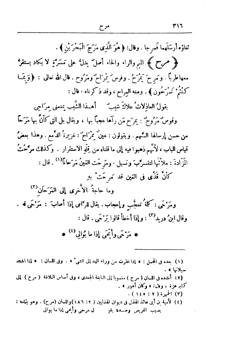 وَقَوْسٌ مَرُوحٌ: يَمْرَحُ مَنْ رَآهَا عَجَبًا بِهَا، وَيُقَالُ بَلِ الَّتِي كَأَنَّ بِهَا مَرَحًا مِنْ حُسْنِ إِرْسَالِهَا السَّهْمَ. وَيَقُولُونَ: عَيْنٌ مِمْرَاحٌ: غَزِيرَةُ الدَّمْعِ. وَهَذَا بَعْضُ قِيَاسِ الْبَابِ، لِأَنَّهُمْ ذَهَبُوا فِيهِ إِلَى مَا قُلْنَاهُ مِنْ قِلَّةِ الِاسْتِقْرَارِ. وَكَذَلِكَ مَرَّحْتُ الْمَزَادَةَ: مَلَأْتُهَا لِتَتَسَرَّبَ وَتَسِيلَ. وَمَرِحَتِ الْعَيْنُ مَرَحَانًا. قَالَ: