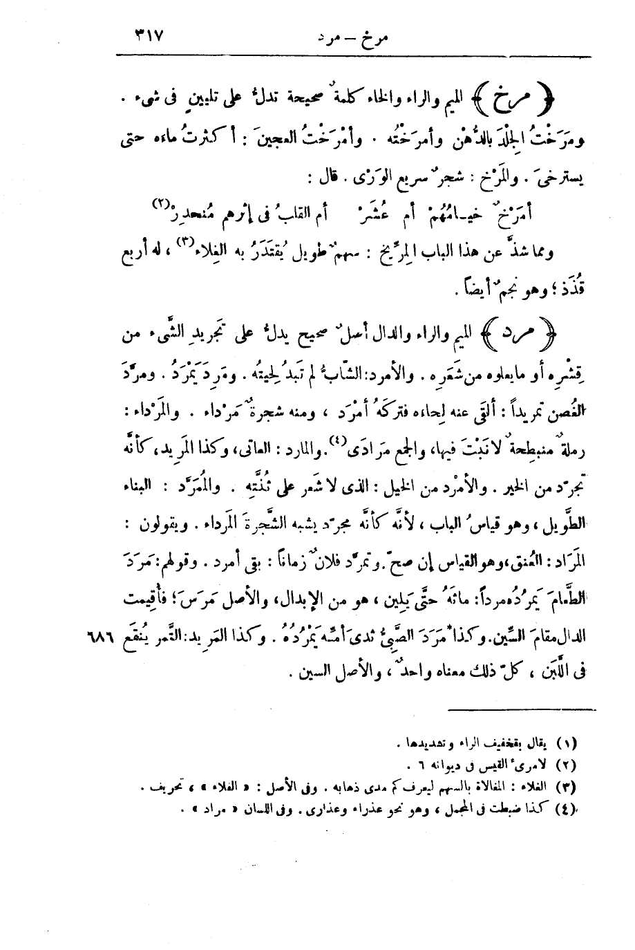 (مَرَدَ) الْمِيمُ وَالرَّاءُ وَالدَّالُ أَصْلٌ صَحِيحٌ يَدُلُّ عَلَى تَجْرِيدِ الشَّيْءِ مِنْ قِشْرِهِ أَوْ مَا يَعْلُوهُ مِنْ شَعْرِهِ. وَالْأَمْرَدُ: الشَّابُّ لَمْ تَبْدُ لِحْيَتُهُ. وَمَرِدَ يَمْرَدُ. وَمَرَّدَ الْغُصْنُ تَمْرِيدًا: أَلْقَى عَنْهُ لِحَاءَهُ فَتَرَكَهُ أَمْرَدَ، وَمِنْهُ شَجَرَةٌ مَرْدَاءُ. وَالْمَرْدَاءُ: رَمْلَةٌ مُنْبَطِحَةٌ لَا نَبْتَ فِيهَا، وَالْجَمْعُ مَرَادَى. وَالْمَارِدُ: الْعَاتِي، وَكَذَا الْمَرِيدُ، كَأَنَّهُ تَجَرَّدَ مِنَ الْخَيْرِ. وَالْأَمْرَدُ مِنَ الْخَيْلِ: الَّذِي لَا شَعْرَ عَلَى ثُنَّتِهِ. وَالْمُمَرَّدُ: الْبِنَاءُ الطَّوِيلُ، وَهُوَ قِيَاسُ الْبَابِ، لِأَنَّهُ كَأَنَّهُ مُجَرَّدٌ يُشْبِهُ الشَّجَرَةَ الْمَرْدَاءَ. وَيَقُولُونَ: الْمَرَادُ: الْعُنُقُ، وَهُوَ الْقِيَاسُ إِنْ صَحَّ. وَتَمَرَّدَ فُلَانٌ زَمَانًا: بَقِيَ أَمَرَدَ. وَقَوْلُهُمْ: مَرَدَ الطَّعَامَ يَمْرُدُهُ مَرْدًا: مَاثَهُ حَتَّى يَلِينَ، هُوَ مِنَ الْإِبْدَالِ، وَالْأَصْلُ مَرَسَ ; فَأُقِيمَتِ الدَّالُ مَقَامَ السِّينِ. وَكَذَا مَرَدَ الصَّبِيُّ ثَدْيَ أُمِّهِ يَمْرُدُهُ. وَكَذَا الْمَرِيدُ: التَّمْرُ يُنْقَعُ فِي اللَّبَنِ، كُلُّ ذَلِكَ مَعْنَاهُ وَاحِدٌ، وَالْأَصْلُ السِّينُ.