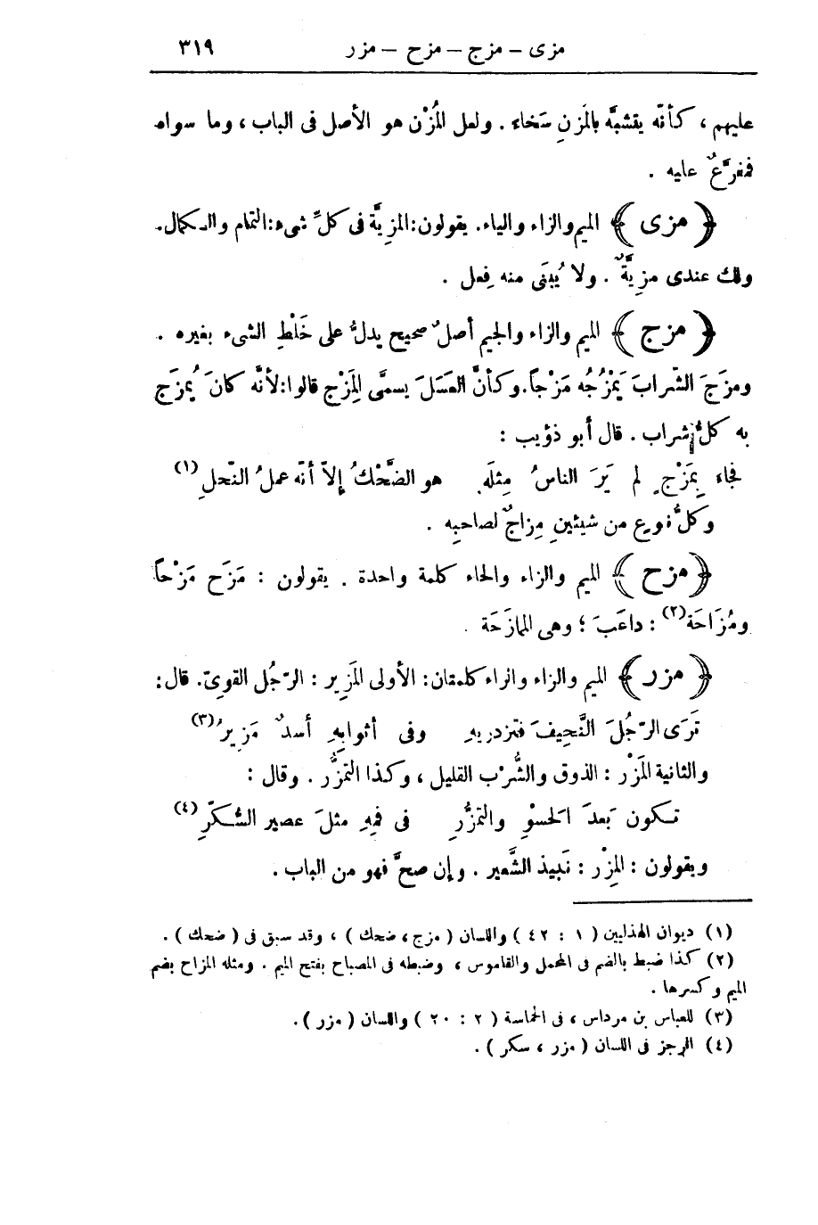(مَزَرَ) الْمِيمُ وَالزَّاءُ وَالرَّاءُ كَلِمَتَانِ: الْأُولَى الْمَزِيرُ: الرَّجُلُ الْقَوِيُّ. قَالَ: