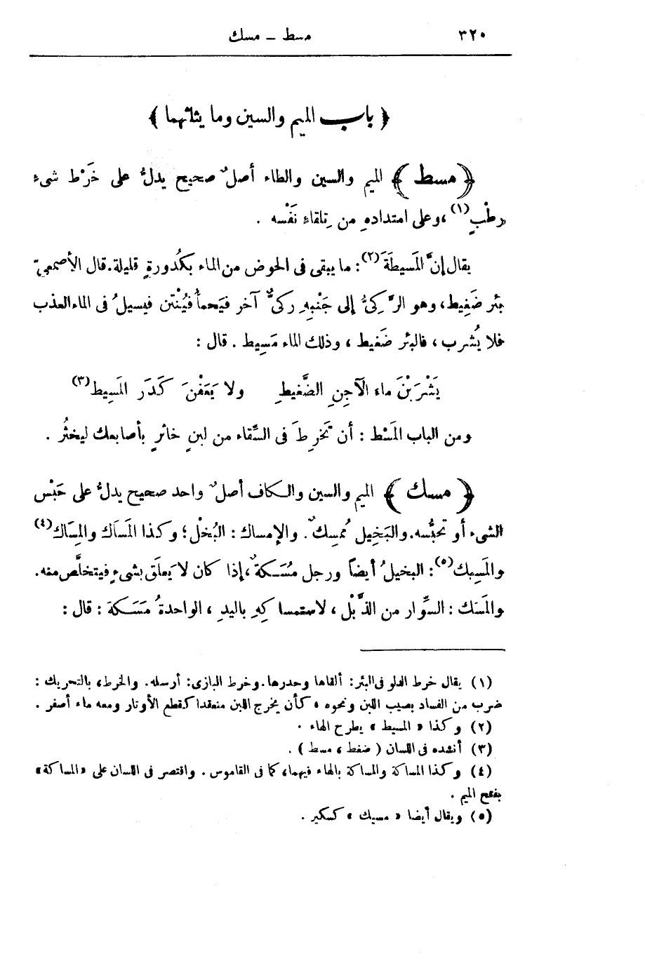(مَسَكَ) الْمِيمُ وَالسِّينُ وَالْكَافُ أَصْلٌ وَاحِدٌ صَحِيحٌ يَدُلُّ عَلَى حَبْسِ الشَّيْءِ أَوْ تَحَبُّسِهِ. وَالْبَخِيلُ مُمْسِكٌ. وَالْإِمْسَاكُ: الْبُخْلُ ; وَكَذَا الْمَسَاكُ وَالْمِسَاكُ وَالْمَسِيكُ: الْبَخِيلُ أَيْضًا وَرَجُلٌ مُسَكَةٌ، إِذْ كَانَ لَا يَعْلَقُ بِشَيْءٍ فَيَتَخَلَّصُ مِنْهُ. وَالْمَسَكُ: السِّوَارُ مِنَ الذَّبْلِ: لِاسْتِمْسَاكِهِ بِالْيَدِ، الْوَاحِدَةُ مَسَكَةٌ. قَالَ: