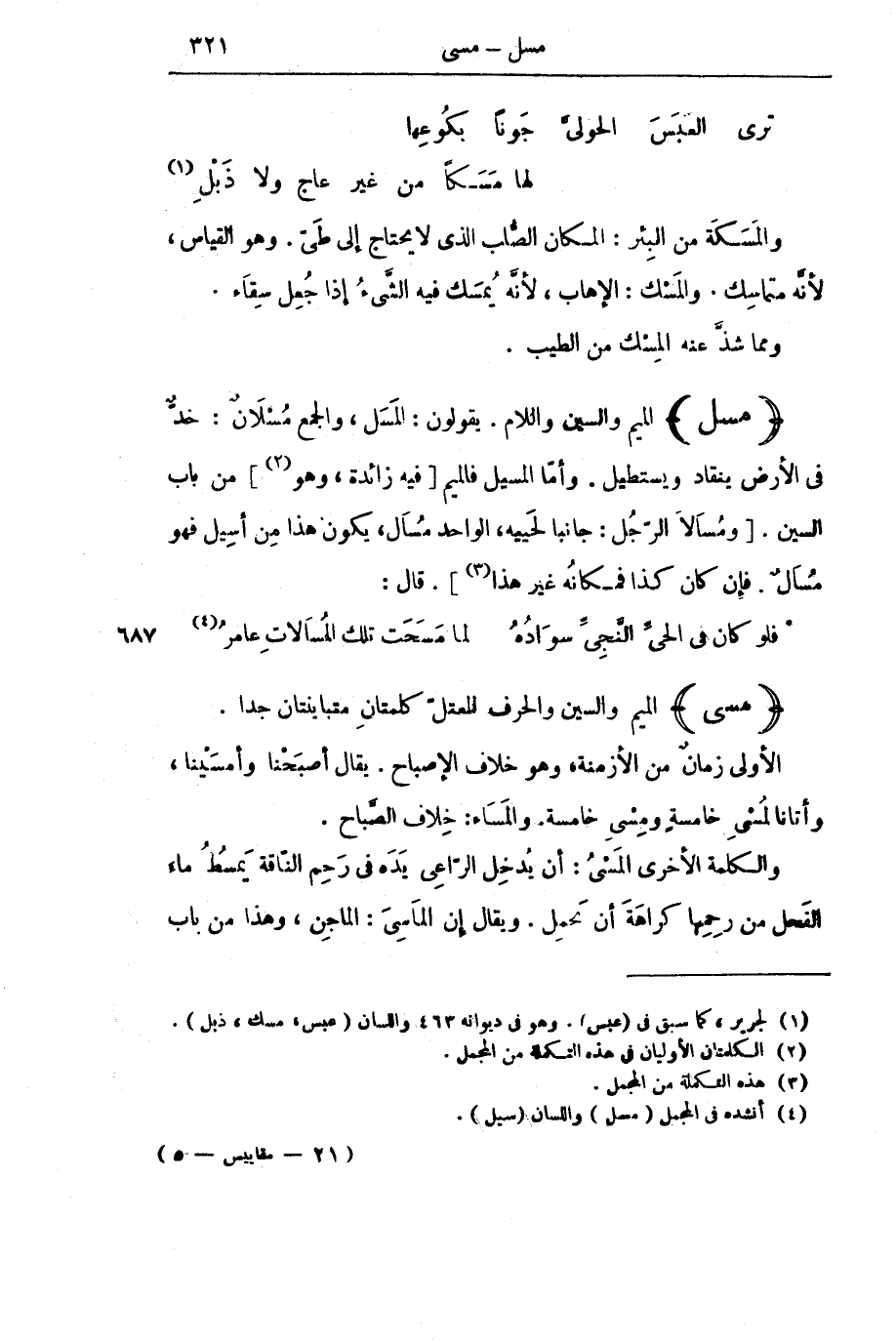 (مَسَلَ) الْمِيمُ وَالسِّينُ وَاللَّامُ. يَقُولُونَ: الْمَسَلُ، وَالْجَمْعُ مُسْلَانٌ: خَدٌّ فِي الْأَرْضِ يَنْقَادُ وَيَسْتَطِيلُ. وَأَمَّا الْمَسِيلُ فَالْمِيمُ [فِيهِ زَائِدَةٌ، وَهُوَ] مِنْ بَابِ السِّينِ. [وَمُسَالَا الرَّجُلِ: جَانِبَا لَحْيَيْهِ، الْوَاحِدُ مُسَالٌ، يَكُونُ هَذَا مِنْ أَسِيلٍ فَهُوَ مُسَالٌ. فَإِنْ كَانَ كَذَا فَمَكَانُهُ غَيْرُ هَذَا] . قَالَ: