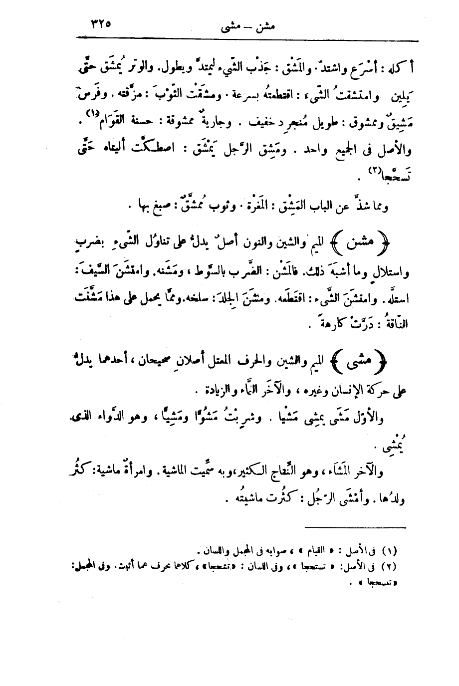 وَالْأَوَّلُ مَشَى يَمْشِي مَشْيًا. وَشَرِبْتُ مَشُوًّا وَمَشِيًّا، وَهُوَ الدَّوَاءُ الَّذِي يُمْشِي.
