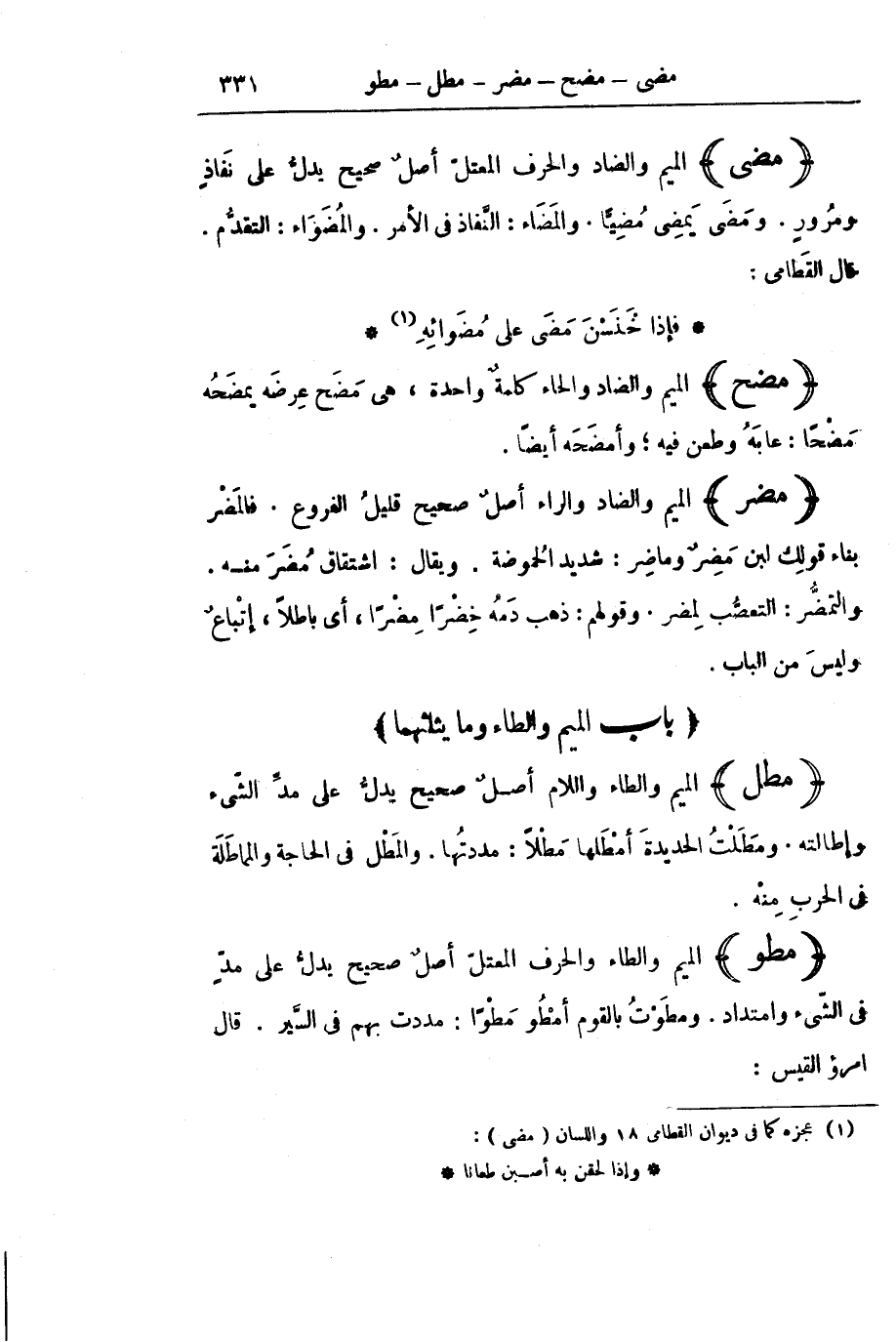 (مَضَى) الْمِيمُ وَالضَّادُ وَالْحَرْفُ الْمُعْتَلُّ أَصْلٌ صَحِيحٌ يَدُلُّ عَلَى نَفَاذٍ وَمُرُورٍ. وَمَضَى يَمْضِي مُضِيَّا. وَالْمَضَاءُ: النَّفَاذُ فِي الْأَمْرِ. وَالْمُضَوَاءُ: التَّقَدُّمُ.