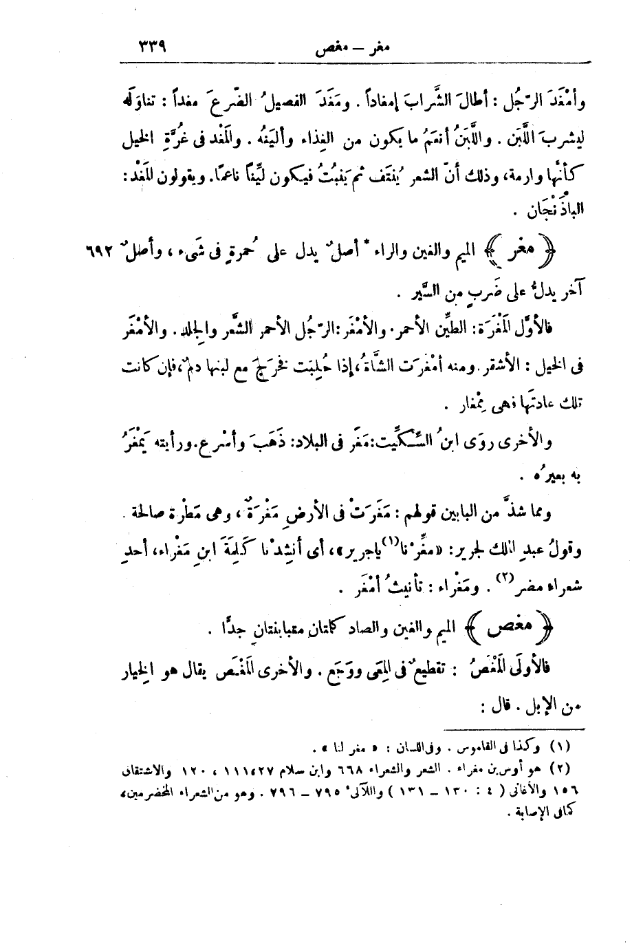وَمِمَّا شَذَّ مِنَ الْبَابَيْنِ قَوْلُهُمْ: مَغَرَتْ فِي الْأَرْضِ مَغْرَةٌ، وَهِيَ مَطْرَةٌ صَالِحَةٌ وَقَوْلُ عَبْدِ الْمَلِكِ لِجَرِيرٍ: " مَغِّرْنَا يَا جَرِيرُ "، أَيْ أَنْشِدْنَا كَلِمَةَ ابْنِ مَغْرَاءَ، أَحَدِ شُعَرَاءِ مُضَرَ. وَمَغْرَاءُ: تَأْنِيثُ أَمْغَرَ.