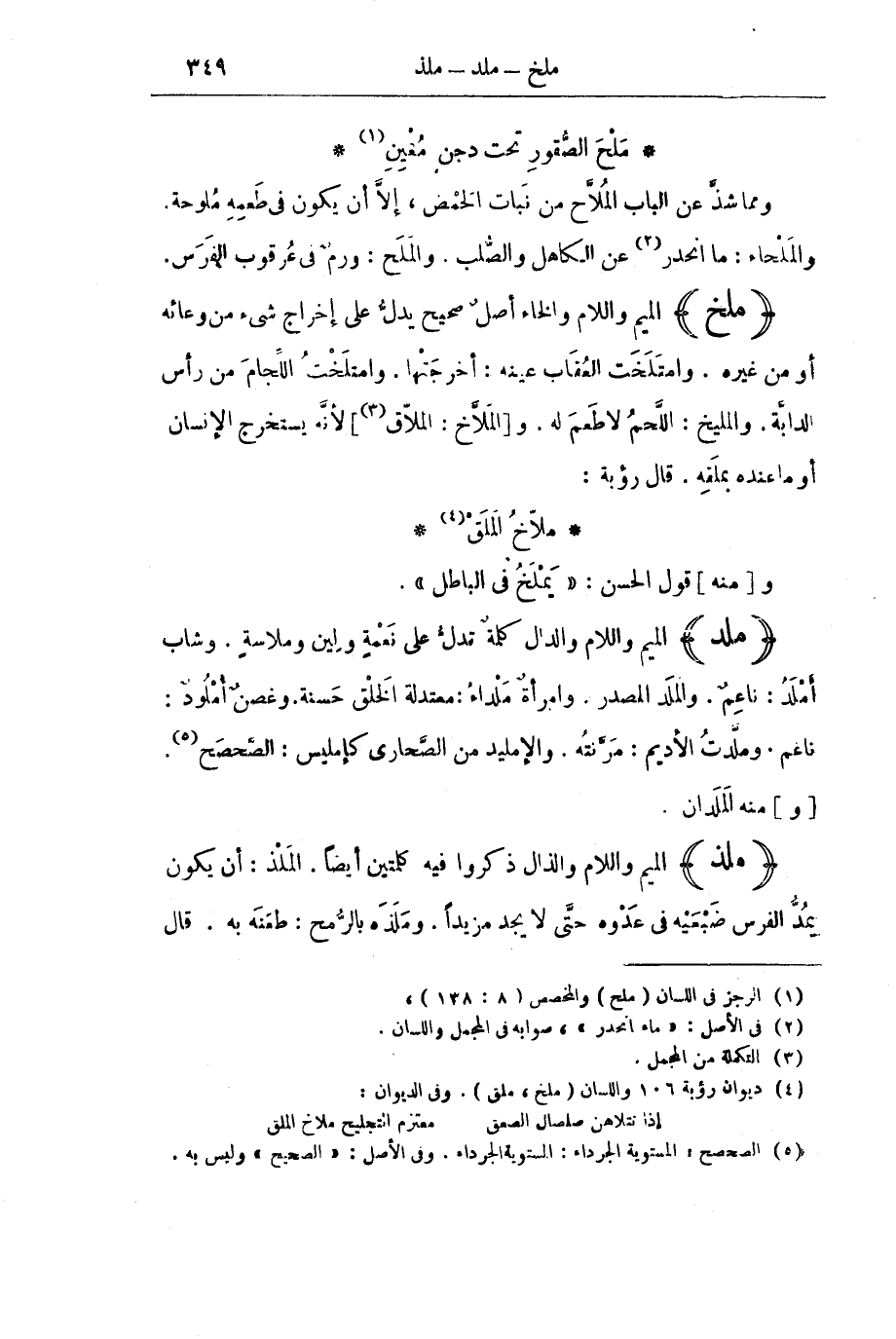 وَمِمَّا شَذَّ عَنِ الْبَابِ: الْمُلَّاحُ مِنْ نَبَاتِ الْحَمْضِ، إِلَّا أَنْ يَكُونَ فِي طَعْمِهِ مُلُوحَةٌ. وَالْمَلْحَاءُ: مَا انْحَدَرَ عَنِ الْكَاهِلِ وَالصُّلْبِ. وَالْمَلَحُ: وَرَمٌ فِي عُرْقُوبِ الْفَرَسِ.