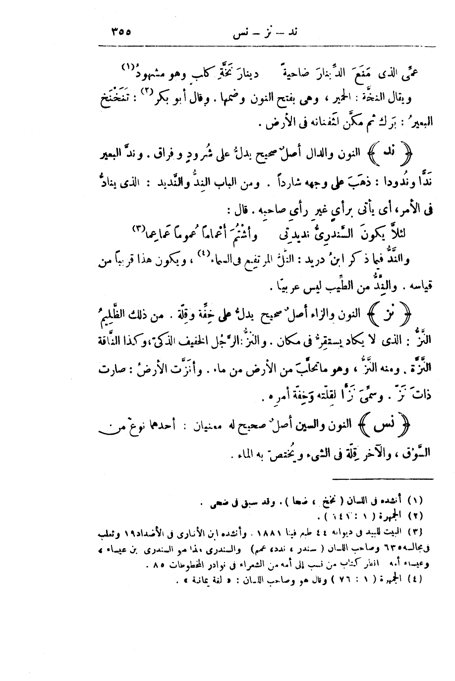 (نَدَّ) النُّونُ وَالدَّالُ أَصْلٌ صَحِيحٌ يَدُلُّ عَلَى شُرُودٍ وَفِرَاقٍ. وَنَدَّ الْبَعِيرُ نَدًّا وَنُدُودًا: ذَهَبَ عَلَى وَجْهِهِ شَارِدًا. وَمِنَ الْبَابِ النِّدُّ وَالنَّدِيدُ: الَّذِي يُنَادُّ فِي الْأَمْرِ، أَيْ يَأْتِي بِرَأْيٍ غَيْرِ رَأْيِ صَاحِبِهِ. قَالَ: