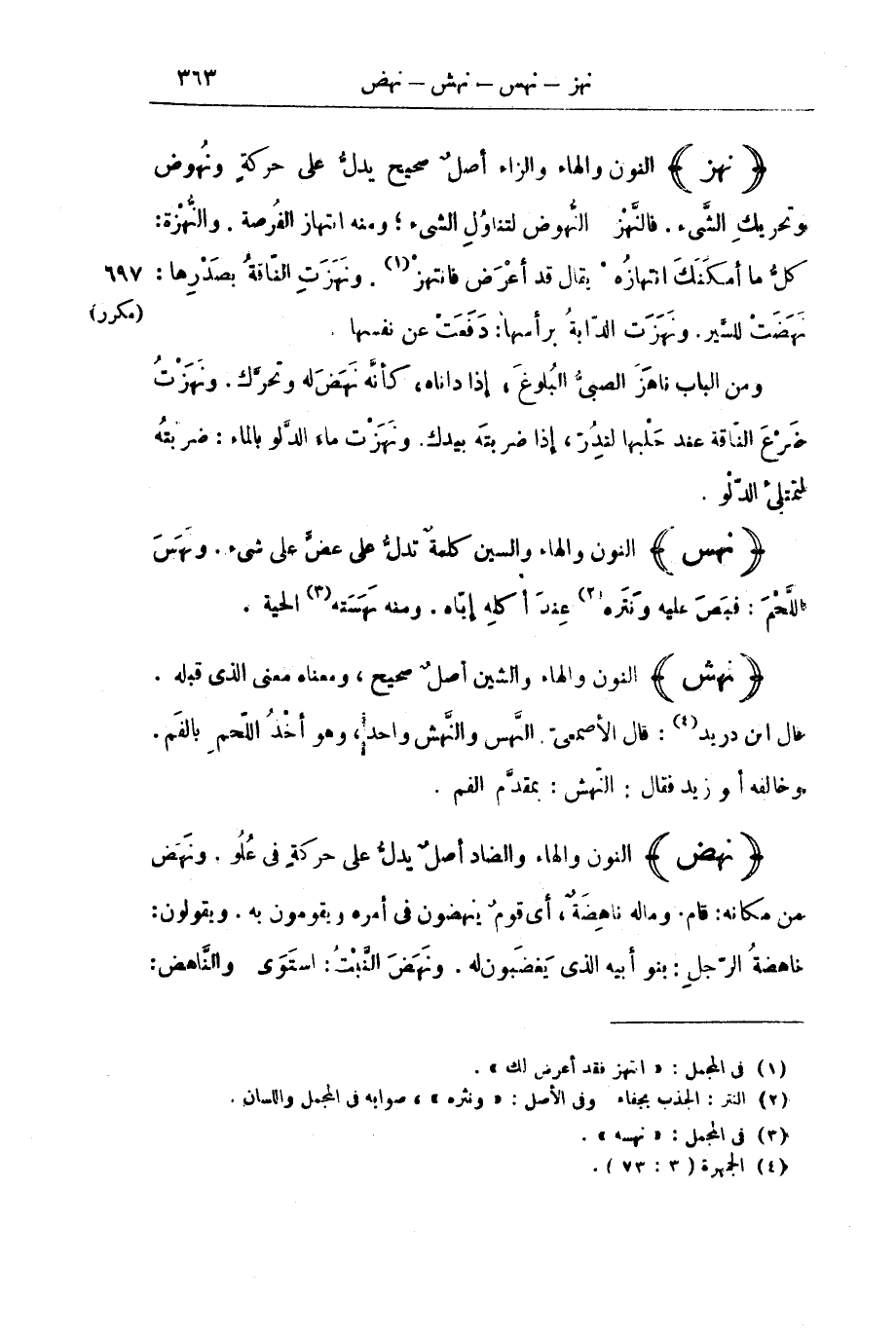 (نَهَشَ) النُّونُ وَالْهَاءُ وَالشِّينُ أَصْلٌ صَحِيحٌ، وَمَعْنَاهُ مَعْنَى الَّذِي قَبْلَهُ. قَالَ ابْنُ دُرَيْدٍ: قَالَ الْأَصْمَعِيُّ النَّهْسُ وَالنَّهْشُ وَاحِدٌ، وَهُوَ أَخْذُ اللَّحْمِ بِالْفَمِ. وَخَالَفَهُ أَبُو زَيْدٍ فَقَالَ: النَّهْشُ: بِمُقَدَّمِ الْفَمِ.
