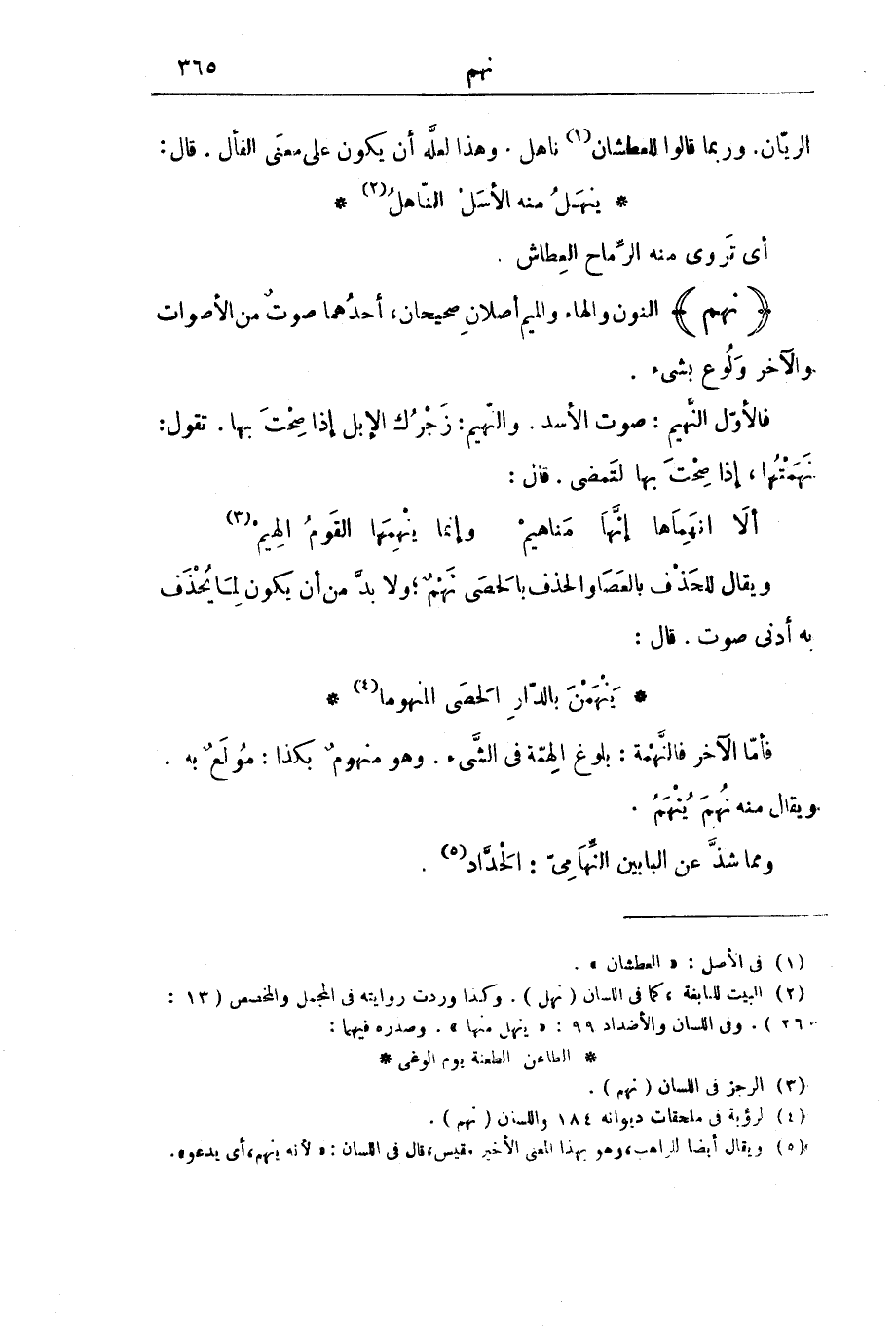 فَالْأَوَّلُ النَّهِيمُ: صَوْتُ الْأَسَدِ. وَالنَّهِيمُ: زَجْرُكَ الْإِبِلَ إِذَا صِحْتَ بِهَا. تَقُولُ: نَهَمْتُهَا، إِذَا صِحْتَ بِهَا لِتَمْضِيَ. قَالَ: