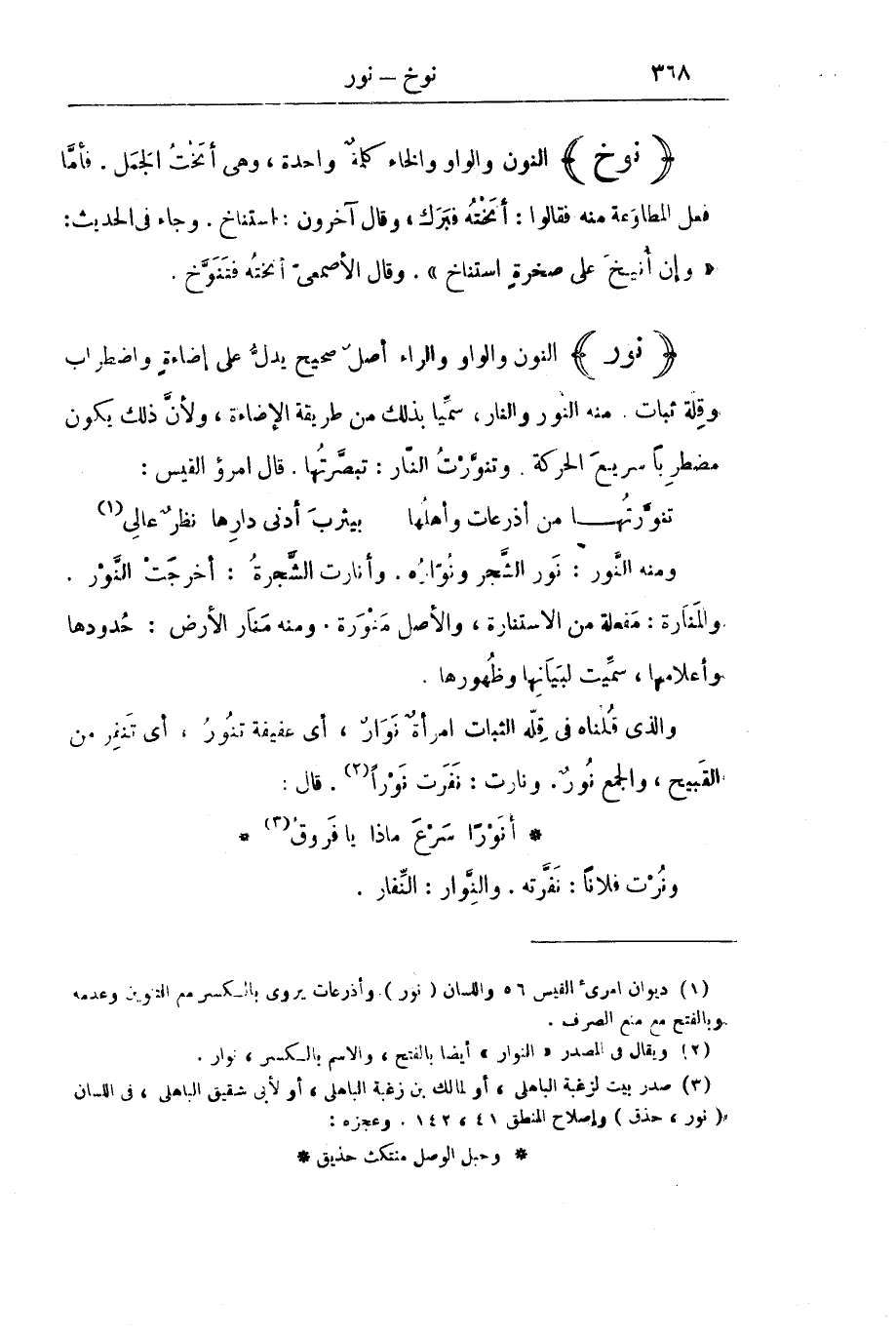 (نَوَرَ) النُّونُ وَالْوَاوُ وَالرَّاءُ أَصْلٌ صَحِيحٌ يَدُلُّ عَلَى إِضَاءَةٍ وَاضْطِرَابٍ وَقِلَّةِ ثَبَاتٍ. مِنْهُ النُّورُ وَالنَّارُ، سُمِّيَا بِذَلِكَ مِنْ طَرِيقَةِ الْإِضَاءَةِ، وَلِأَنَّ ذَلِكَ يَكُونُ مُضْطَرِبًا سَرِيعَ الْحَرَكَةِ. وَتَنَوَّرْتُ النَّارَ: تَبَصَّرْتُهَا. قَالَ امْرُؤُ الْقَيْسِ:
