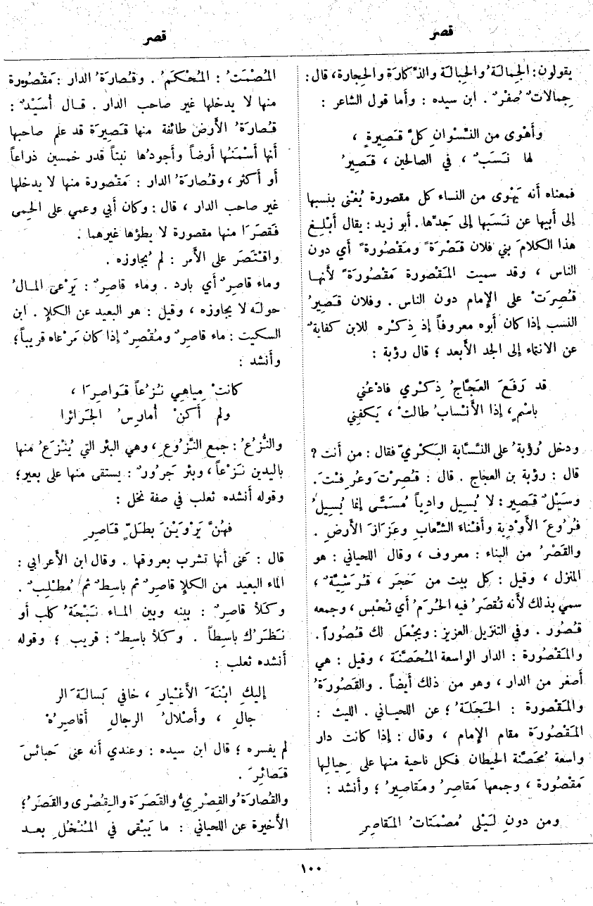 وَدَخَلَ رُؤْبةُ عَلَى النَّسَّابة البَكْريّ فَقَالَ: مَنْ أَنت قَالَ: رُؤْبَةُ بْنُ الْعَجَّاجِ. قَالَ: قُصِرْتَ وعُرِفْتَ. وسَيْلٌ قَصِير: لَا يُسِيل وادِياً مُسَمًّى إِنما يُسِيلُ فُرُوعَ الأَوْدِية وأَفْناءَ الشِّعابِ وعَزَازَ الأَرضِ. والقَصْرُ مِنَ الْبِنَاءِ: مَعْرُوفٌ، وَقَالَ اللِّحْيَانِيُّ: هُوَ الْمَنْزِلُ، وَقِيلَ: كُلُّ بَيْتٍ مِنْ حَجَر، قُرَشِيَّةٌ، سُمِّيَ بِذَلِكَ لأَنه تُقصَرُ فِيهِ الحُرَمُ أَي تُحْبس، وَجَمْعُهُ قُصُور. وَفِي التَّنْزِيلِ الْعَزِيزِ: وَيَجْعَلْ لَكَ قُصُوراً