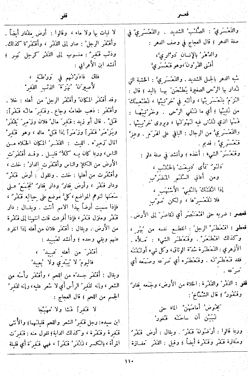 قفر: القَفْرُ والقَفْرة: الخلاءُ مِنَ الأَرض، وَجَمْعُهُ قِفارٌ وقُفُورٌ؛ قَالَ الشَّمَّاخُ: