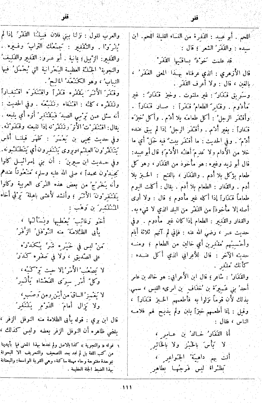 وَالْعَرَبُ تَقُولُ: نَزَلْنَا بِبَنِي فُلَانٍ فبِتْنا القَفْرَ إِذا لَمْ يُقْرَوْا. والتَّقْفِير: جَمْعُك الترابَ وَغَيْرَهُ. والقَفِير: الزَّبيل؛ يَمَانِيَةٌ. أَبو عمرو: القَفِير القَلِيفُ وَالنَّجَوِيَّةُ «2» الجُلَّة الْعَظِيمَةُ البَحْرانية الَّتِي يُحْمَلُ فِيهَا القِبابُ، وَهُوَ الكَنْعَدُ المالِحُ. وقَفَرَ الأَثَرَ يَقْفُره قَفْراً واقْتَفَرَه اقْتِفاراً وتَقَفَّره، كلُّه: اقْتَفاه وتَتَبَّعَه. وَفِي الْحَدِيثِ: