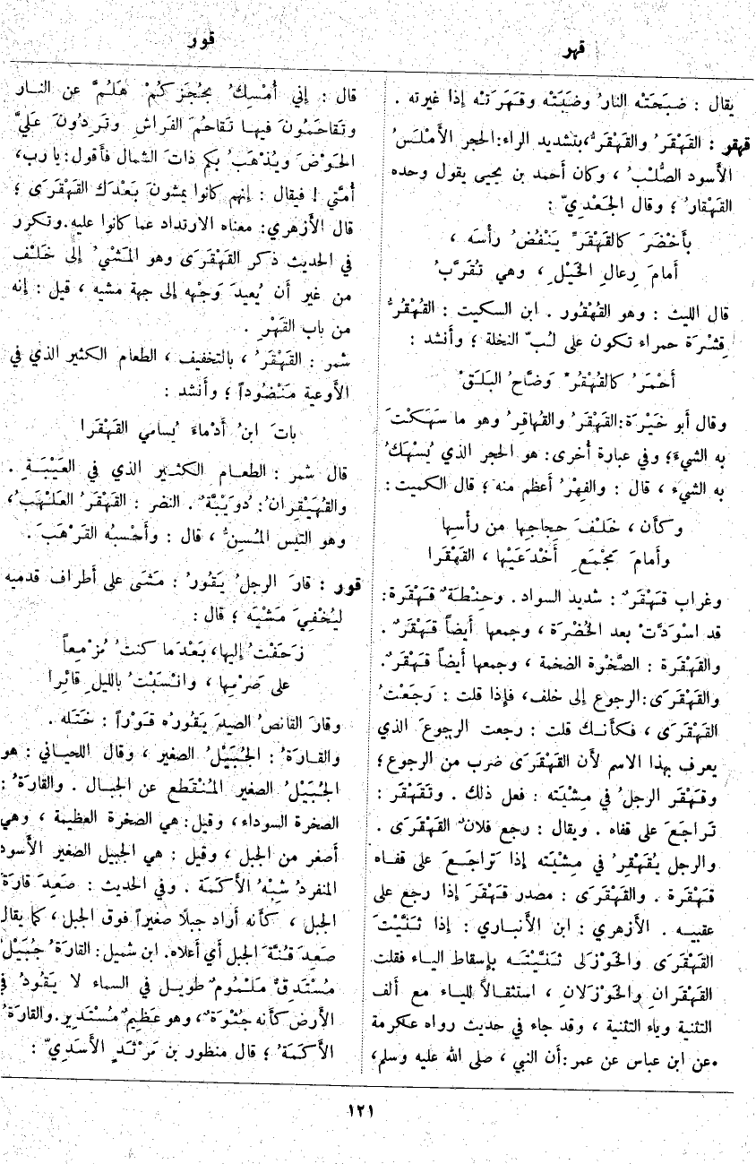 قهقر: القَهْقَرُ والقَهْقَرُّ، بِتَشْدِيدِ الرَّاءِ: الْحَجَرُ الأَمْلَسُ الأَسود الصُّلْبُ، وَكَانَ أَحمد بْنُ يَحْيَى يَقُولُ وَحْدَهُ القَهْقارُ؛ وَقَالَ الجَعْدِيّ: