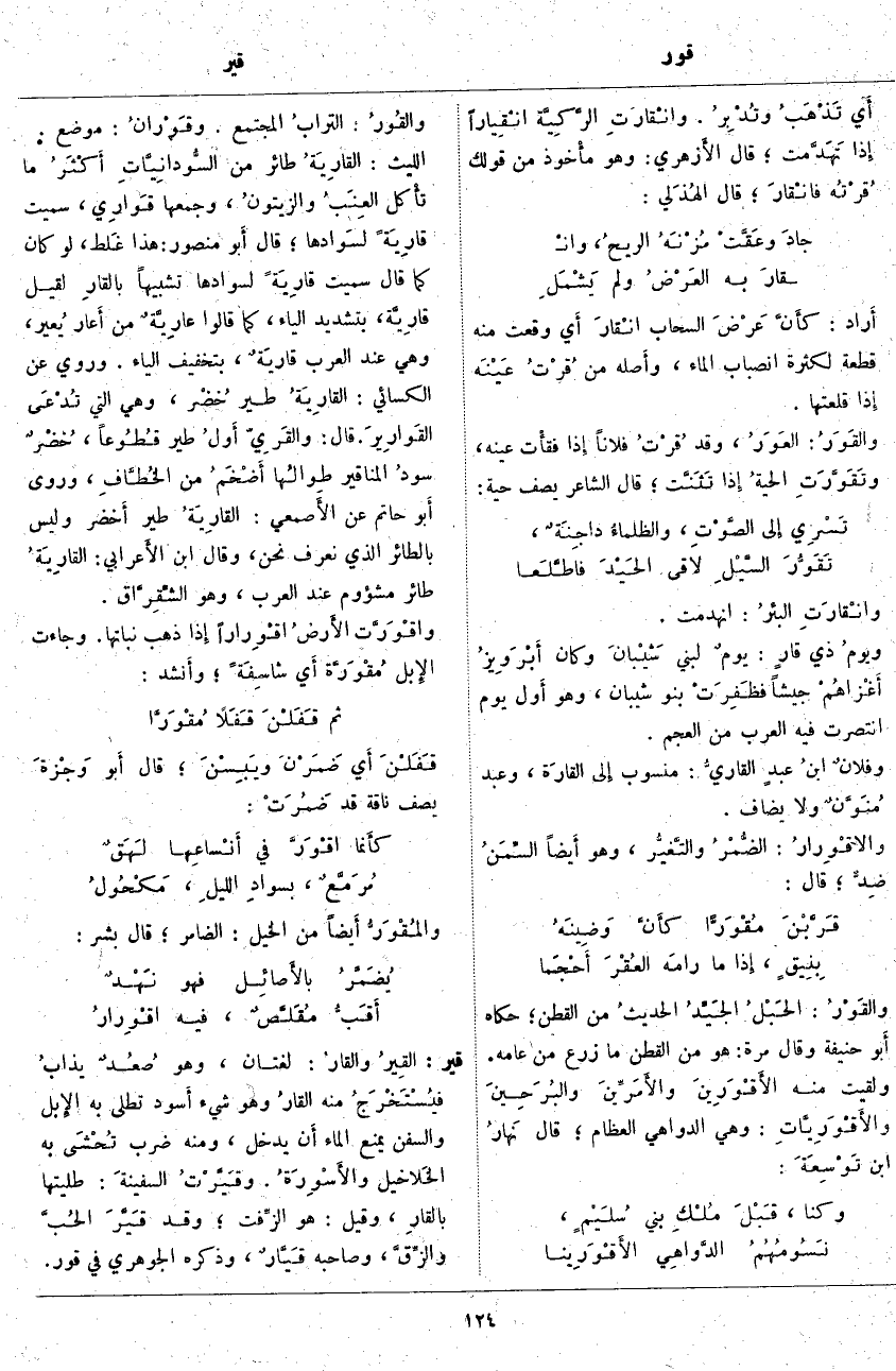 والقُورُ: الترابُ الْمُجْتَمِعُ. وقَوْرانُ: مَوْضِعٌ. اللَّيْثُ القارِيَةُ طَائِرٌ مِنَ السُّودانِيَّاتِ أَكْثَرُ مَا تأْكل العِنَبُ والزيتونُ، وَجَمْعُهَا قَوارِي، سُمِّيَتْ قارِيَةً لسَوادها؛ قَالَ أَبو مَنْصُورٍ: هَذَا غَلط، لَوْ كَانَ كَمَا قَالَ سُمِّيَتْ قارِيةً لِسَوَادِهَا تَشْبِيهًا بالقارِ لَقِيلَ قارِيَّة، بِتَشْدِيدِ الْيَاءِ، كَمَا قَالُوا عارِيَّةٌ مِنْ أَعار يُعير، وَهِيَ عِنْدَ الْعَرَبِ قاريَةٌ، بِتَخْفِيفِ الْيَاءِ. وَرُوِيَ عَنِ الْكِسَائِيِّ: القارِيَةُ طَيْرٌ خُضْر، وَهِيَ الَّتِي تُدْعَى القَوارِيرَ. قَالَ: والقَرِيِّ أَولُ طَيْرٍ قُطُوعاً، خُضْرٌ سودُ الْمَنَاقِيرِ طِوالُها أَضْخَمُ مِنَ الخُطَّافِ، وَرَوَى أَبو حَاتِمٍ عَنِ الأَصمعي: القارِيَةُ طَيْرٌ أَخضر وَلَيْسَ بِالطَّائِرِ الَّذِي نَعْرِفُ نَحْنُ، وَقَالَ ابْنُ الأَعرابي: القارِيَةُ طائر مشؤوم عِنْدَ الْعَرَبِ، وَهُوَ الشِّقِرَّاق. واقْوَرَّت الأَرضُ اقْوِراراً إِذَا ذَهَبَ نَبَاتُهَا. وَجَاءَتِ الإِبل مُقْوَرَّة أَي شاسِفَةً؛ وأَنشد: