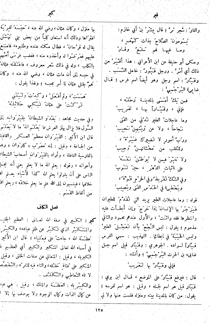 كبر: الكَبير فِي صِفَةِ اللَّهِ تَعَالَى: الْعَظِيمُ الْجَلِيلُ والمُتَكَبِّر الَّذِي تَكَبَّر عَنْ ظُلْمِ عِبَادِهِ، والكِبْرِياء عَظَمَة اللَّهِ، جاءتْ عَلَى فِعْلِياء؛ قَالَ ابْنُ الأَثير: فِي أَسماء اللَّهِ تَعَالَى الْمُتَكَبِّرُ وَالْكَبِيرُ أَي الْعَظِيمُ ذُو الْكِبْرِيَاءِ، وَقِيلَ: الْمُتَعَالِي عَنْ صِفَاتِ الْخَلْقِ، وَقِيلَ: الْمُتَكَبِّرُ عَلَى عُتاةِ خَلْقه، وَالتَّاءُ فِيهِ لِلتَّفَرُّدِ والتَّخَصُّصِ لَا تَاءُ التَّعاطِي والتَّكَلُّف. والكِبْرِياء: العَظَمة وَالْمُلْكُ، وَقِيلَ: هِيَ عِبَارَةٌ عَنْ كَمَالِ الذَّاتِ وَكَمَالِ الْوُجُودِ وَلَا يُوصَفُ بِهَا إِلَّا اللَّهُ
