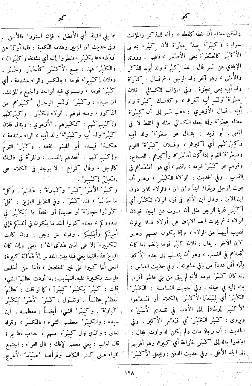 وَلَكِنَّ مَعْنَاهُ أَن لَفْظَهُ كَلَفْظِهِ، وأَنه لِلْمُذَكَّرِ وَالْمُؤَنَّثِ سَوَاءٌ، وكِبْرَة ضِدُّ عِجْزَة لأَن كِبْرة بِمَعْنَى الأَكْبَر كالصِّغْرَة بِمَعْنَى الأَصْغَر، فَافْهَمْ. وَرَوَى الإِيادي عَنْ شِمْرٍ قَالَ: هَذَا كِبْرَة وَلَدِ أَبويه لِلذَّكَرِ والأُنثى، وَهُوَ آخِرُ وَلَدِ الرَّجُلِ، ثُمَّ قَالَ: كِبْرَة وَلَدِ أَبيه بِمَعْنَى عِجْزة. وَفِي الْمُؤَلَّفِ لِلْكِسَائِيِّ: فُلَانٌ عِجْزَةُ ولَدِ أَبيه آخِرُهُمْ، وَكَذَلِكَ كِبْرَة وَلَدِ أَبيه، قَالَ الأَزهري: ذَهَبَ شِمْرٌ إِلى أَن كِبْرَة مَعْنَاهُ عِجْزَة وإِنما جَعَلَهُ الْكِسَائِيُّ مِثْلَهُ فِي اللَّفْظِ لَا فِي الْمَعْنَى. أَبو زَيْدٍ: يُقَالُ هُوَ صِغْرَةُ وَلَدِ أَبيه وكِبْرَتُهم أَي أَكبرهم، وَفُلَانٌ كِبْرَةُ الْقَوْمِ وصِغْرَةُ الْقَوْمِ إِذا كَانَ أَصْغَرَهم وأَكبرهم. الصِّحَاحُ: وَقَوْلُهُمْ هُوَ كُبْرُ قَوْمِهِ، بِالضَّمِّ، أَي هُوَ أَقْعَدُهم فِي النَّسَبِ. وَفِي الْحَدِيثِ: