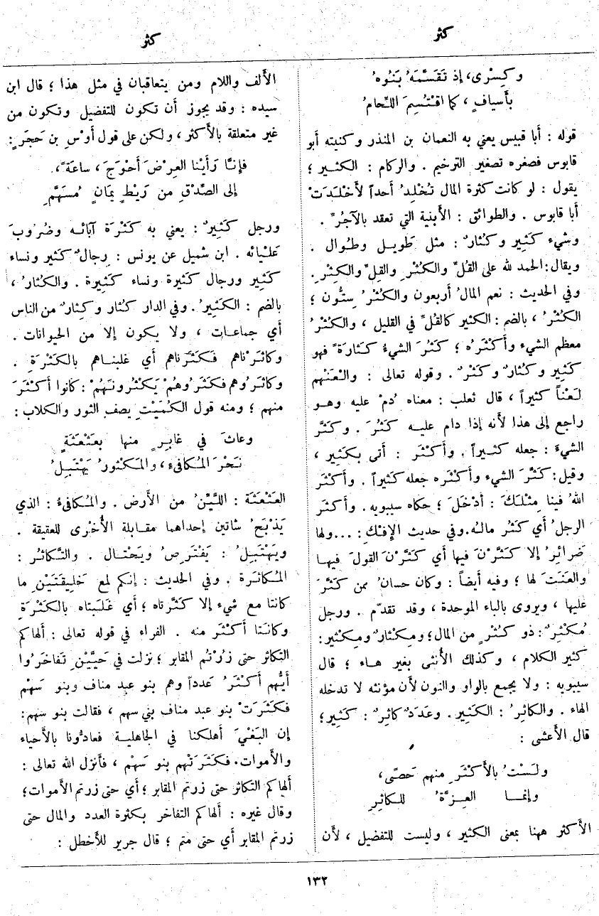 ؛ الكُثْرُ، بِالضَّمِّ: الْكَثِيرُ كالقُلِّ فِي الْقَلِيلِ، والكُثْرُ مُعْظَمُ الشَّيْءِ وأَكْثَرُه؛ كَثُرَ الشيءُ كَثارَةً فَهُوَ كَثِير وكُثارٌ وكَثْرٌ. وَقَوْلُهُ تَعَالَى: والْعَنْهم لَعْناً كَثِيرًا، قَالَ ثَعْلَبٌ: مَعْنَاهُ دُمْ عَلَيْهِ وَهُوَ رَاجِعٌ إِلى هَذَا لأَنه إِذا دَامَ عَلَيْهِ كَثُرَ. وكَثَّر الشيءَ: جَعَلَهُ كَثِيرًا. وأَكْثَر: أَتى بكَثِير، وَقِيلَ: كَثَّرَ الشَّيْءَ وأَكْثَره جَعَلَهُ كَثيراً. وأَكْثَر اللهُ فِينَا مِثْلَكَ: أَدْخَلَ؛ حَكَاهُ سِيبَوَيْهِ. وأَكثَر الرجلُ أَي كَثُر مالُه. وَفِي حَدِيثِ الإِفْك: ...