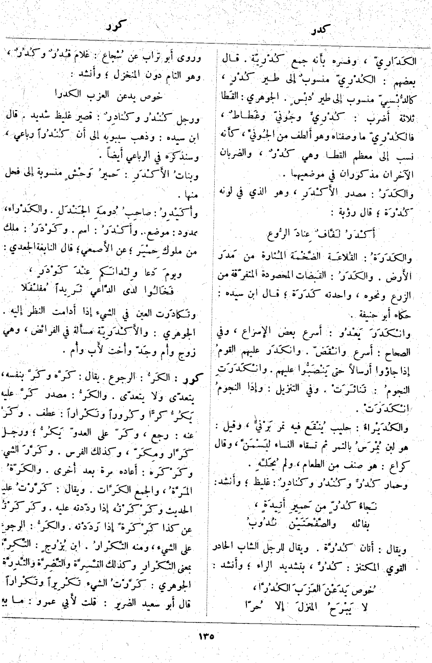 الكَدَارِيّ، وَفَسَّرَهُ بأَنه جَمْعُ كُدْرِيّة. قَالَ بَعْضُهُمْ: الكُدْرِيّ منسوبٌ إِلى طَيْرِ كُدْرٍ، كالدُّبْسِيّ مَنْسُوبٌ إِلى طَيْرِ دُبْسٍ. الْجَوْهَرِيُّ: القَطا ثَلَاثَةُ أَضرب: كُدْرِيٌّ وجُونيّ وغَطاطٌ، فالكُدْرِيّ مَا وَصَفْنَاهُ وَهُوَ أَلطف مِنَ الجُونيِّ، كأَنه نُسِبَ إِلى مُعْظَمِ الْقَطَا وَهِيَ كُدْرٌ، وَالضَّرْبَانِ الْآخَرَانِ مَذْكُورَانِ فِي مَوْضِعَيْهِمَا. والكَدَرُ: مَصْدَرُ الأَكْدَرِ، وَهُوَ الَّذِي فِي لَوْنِهِ كُدْرَة؛ قَالَ رُؤْبَةُ: